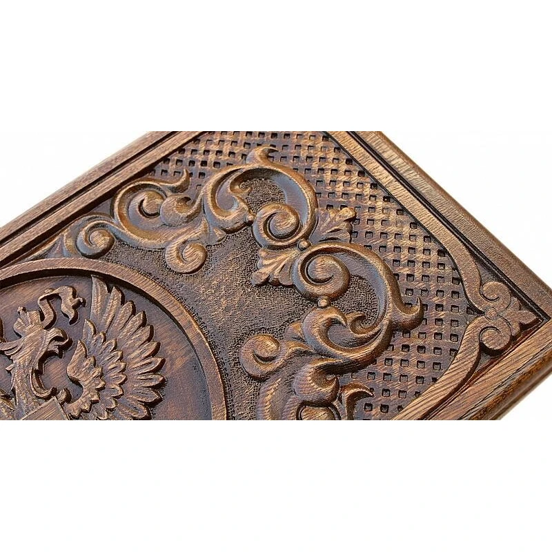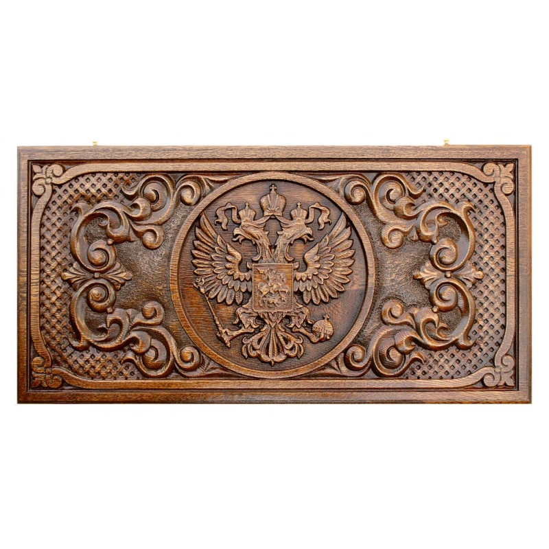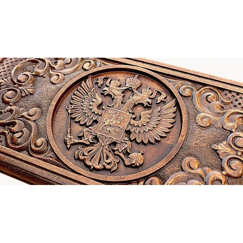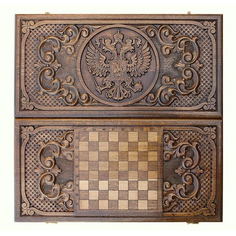 Нарды резные Герб РФ 2", Mkhitaryan – дорогая статусная вещь премиум класса. Сочетание натурального дерева прочных пород, изысканной резьбы ручной работы и высокого стиля! Это первоклассное изделие, которое вы оцените по достоинству. Дорогой подарок для дорогих людей: Доска и фишки сделаны из прочного бука На доске вручную вырезано изображение герба России Петли из литой бронзы Для хранения доски предусмотрен фирменный чехол Красивые нарды станут идеальным памятным презентом для ценителей оригинальных вещей с характером. Их можно подарить друзьям и родственникам, начальнику, коллеге, партнеру по бизнесу. "