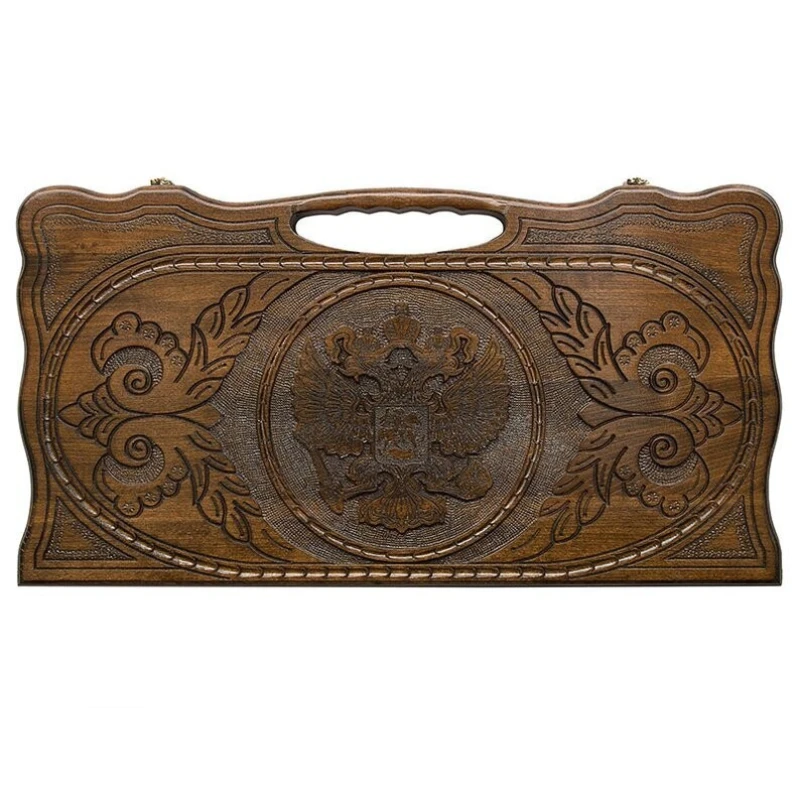 Данный экземпляр сочетает в себе отличные материалы, высокое качество изготовления, изысканное внешнее оформление и гуманный ценник. Нарды резные герб РФ 2 создаются мастером Кареном Халеяном, чье имя известно далеко за пределами родной Армении. Он всегда уделяет большое внимание деталям – обработке поверхностей, резьбе и всему остальному. Благодаря такому подходу, данная доска становится очень привлекательной покупкой для себя, либо в качестве подарка другу, родственнику или коллеге. Хороший выбор материалов Чтобы доска прослужила долгое время, мастер использует цельный массив дерева бук. Она обеспечивает долгий срок эксплуатации, особенно если периодически за ней ухаживать, очищать от пыли и грязи, не допускать попадания жидкостей и прямых солнечных лучей. Ее прочность позволяет не беспокоиться о сохранности при небольших механических воздействиях, вроде падения с высоты до 1 метра или случайных ударах о твердые поверхности. Защита от влаги обеспечивается посредством нескольких слоев лака, дополнительно придающих изысканного блеска всему изделию. Петли и крючки также прослужат долгое время, так как изготовлены из мягкой бронзы. Чтобы было приятно играть Внешним украшением тут служит вырезанное изображение российского герба. С обеих сторон имеется узор в виде лаврового венка и мелкого текстурирования. На задней поверхности имеется поле для игры в шашки, которое позволит отвлечься от напряженных партий в нарды. Изнутри ячейки подчеркиваются при помощи удлиненных треугольников. На петлях имеется гравировка эмблемы мастера, в форме буквы H. Для переноса в руках предусмотрена ручка с эргономичными прорезями. Мягкий тканевый чехол поможет обезопасить поверхности от налипания грязи и пыли при длительном хранении.