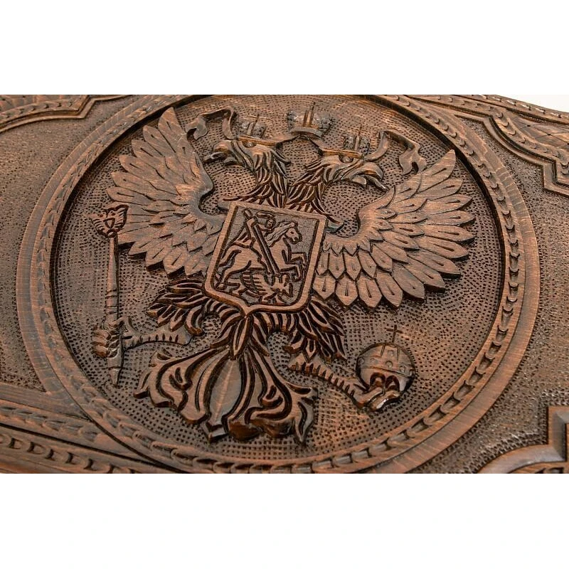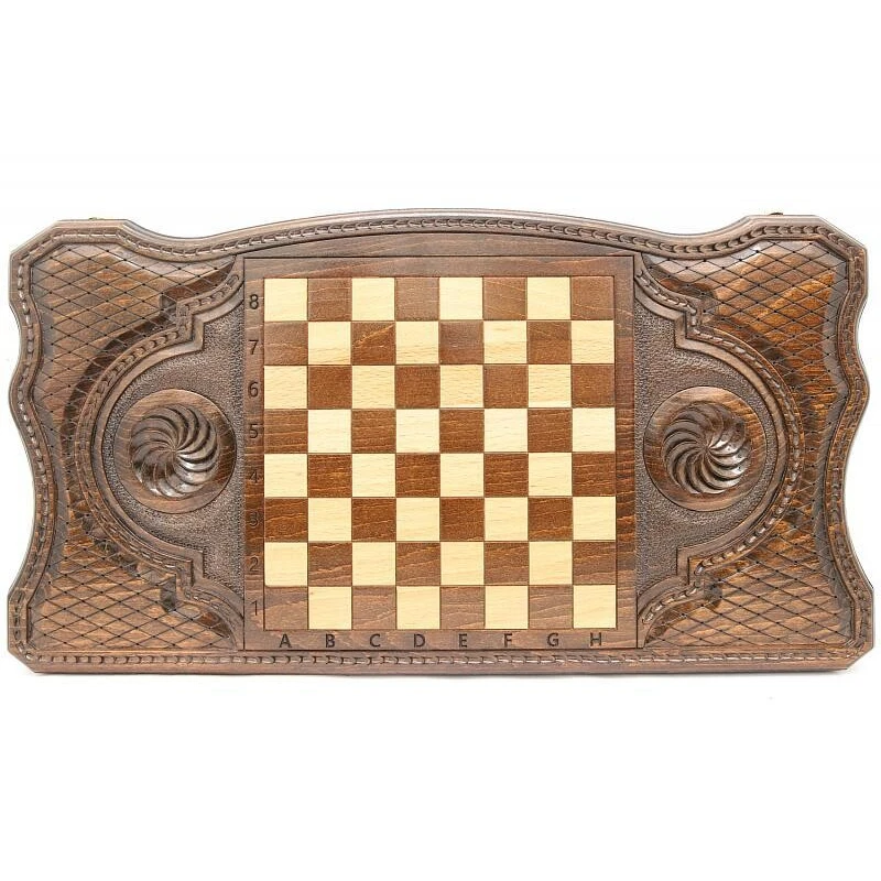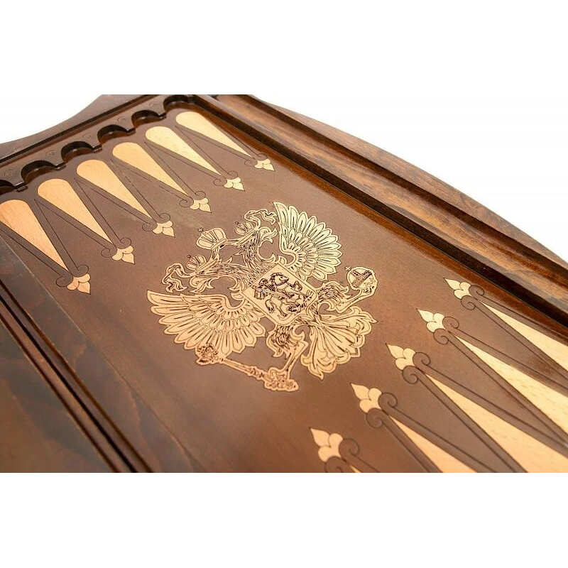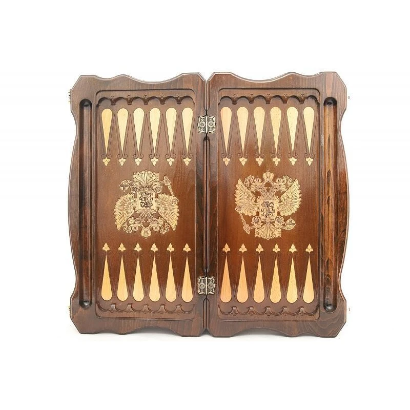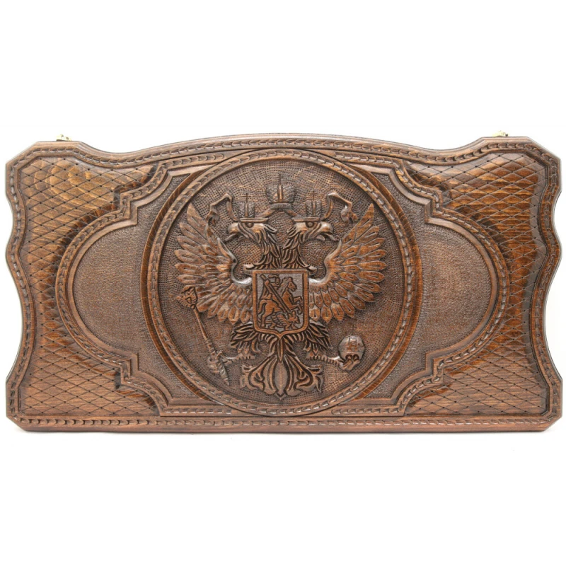 Что в коробке? 32 фишки; 2 игральные кости; доска; чехол. Подарочные нарды «Герб РФ 2», изготовленные талантливым мастером – прекрасный вариант пополнения личной коллекции классических настольных игр или как подарок. Модель выполнена из благородной буковой древесины с ручной резьбой и качественным лаковым покрытием. Верхняя крышка украшена изображением герба Российской Федерации, а также абстрактными резными узорами, присутствующими и на других частях доски. Оборотная внешняя сторона – поле для игры в шашки. Части доски соединены между собой надежной и износостойкой фурнитурой из настоящей меди. Хранить и носить с собой игровой комплект удобно в специальном чехле.