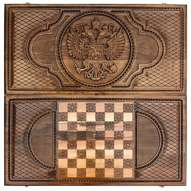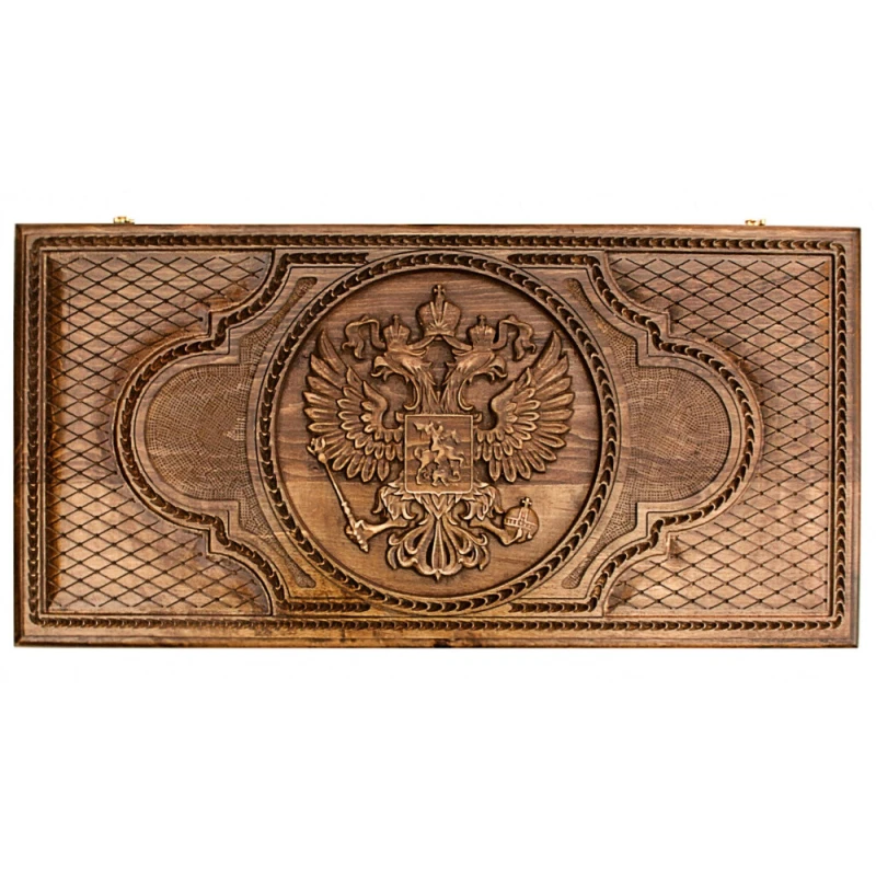 Что в коробке? Доска; Защитный чехол; 30 фишек; 2 шестигранных кубика. Изящный подарочный набор резных нард «Герб РФ», автором которого является один из самых знаменитых современных мастеров – достойное пополнение любой коллекции настольных игр. Качественный и презентабельный набор можно подарить коллеге, другу, родственнику, увлекающемуся классическими настолками. Доска сделана из натуральной древесины высокого качества. Верхняя крышка декорирована рельефным изображением герба РФ и красивым узором. Нижняя крышка – поле для шашек. Разворот полностью отведен под нардовое поле. Доска оснащена медной фурнитурой и защищена от царапин глянцевым лаком.