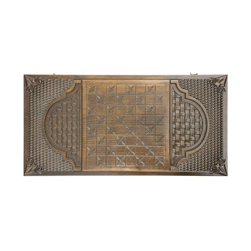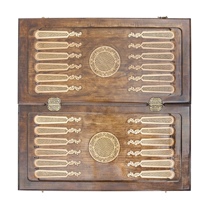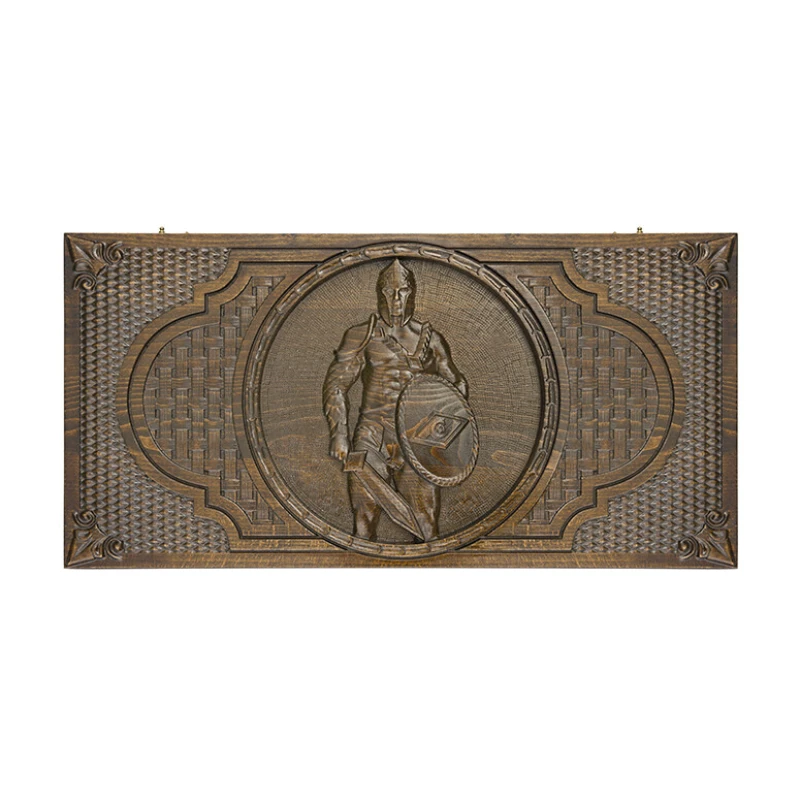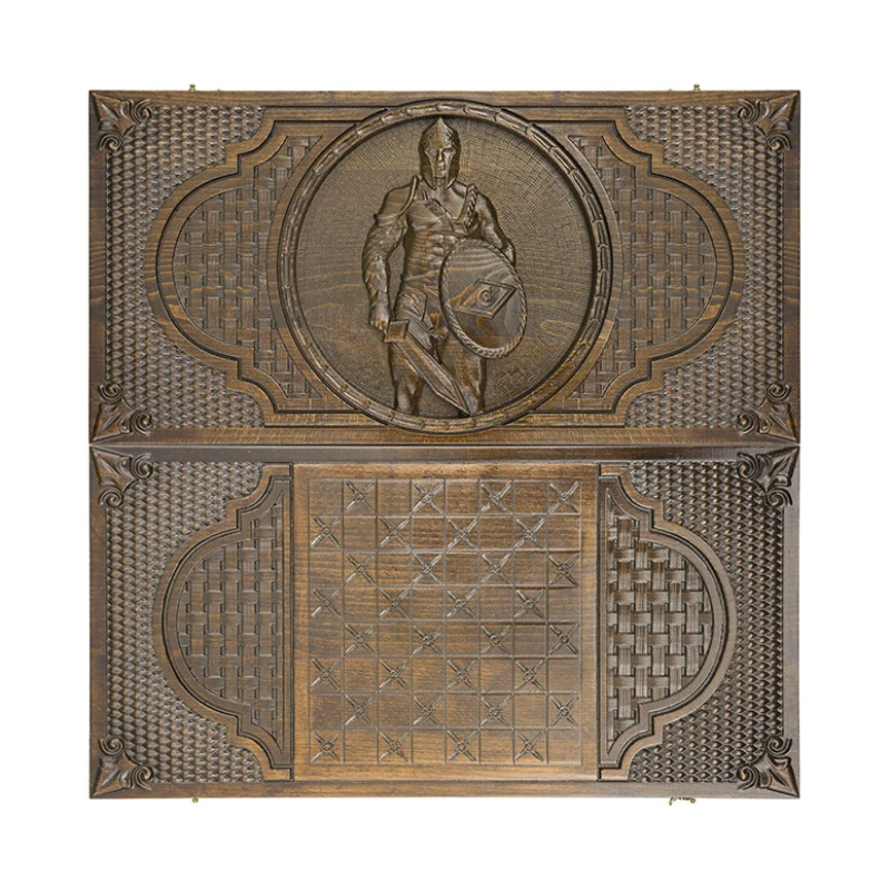 Для тех, кто ценит красоту и не собирается довольствоваться обычными изделиями, Давид Мхитарян изготавливает нарды резные «Гладиатор 1». Это не просто игровая поверхность, а настоящая картина, что становится видно уже при первом взгляде на переднюю створку. Тут в центре вырезан гладиатор, а вокруг него несколько типов узоров. Задняя сторона также вся в орнаменте, а середину занимает шашечное поле.