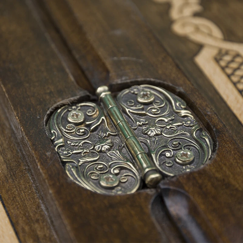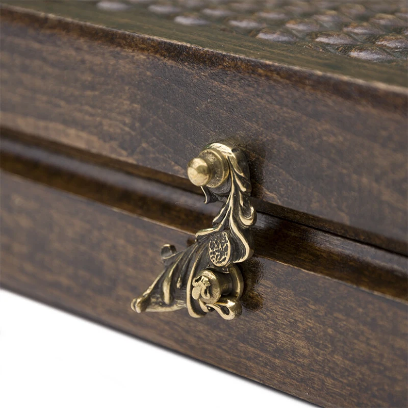 Изготовлена доска из бука, который сочетает в себе – прочность, долговечность, удобство при вырезании мелких элементов. Створки скрепляются при помощи петель из чистой бронзы, а закрываются крючком из этого же материала. Причём они выполнены в едином стиле со всем остальным. В комплекте есть необходимое количество фишек, а также чехол из мягкой ткани для хранения и транспортировки.