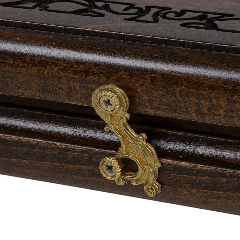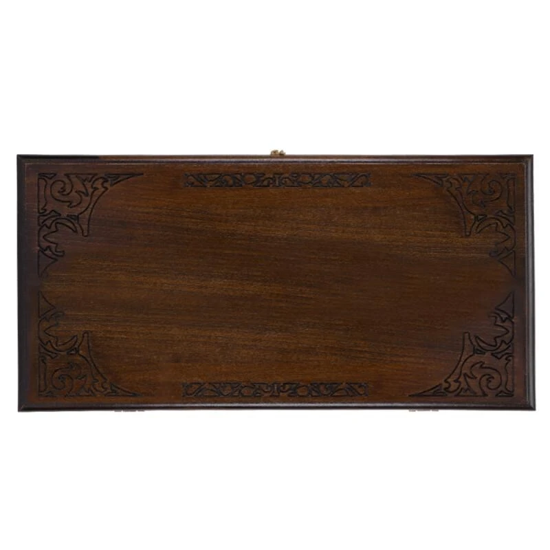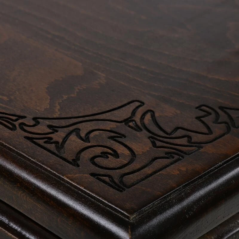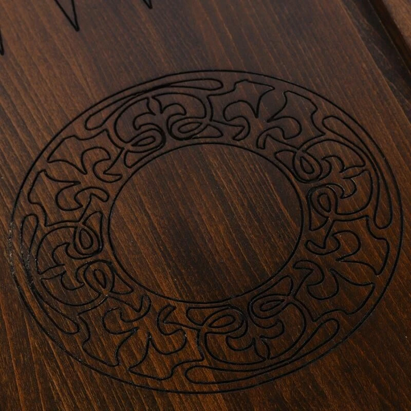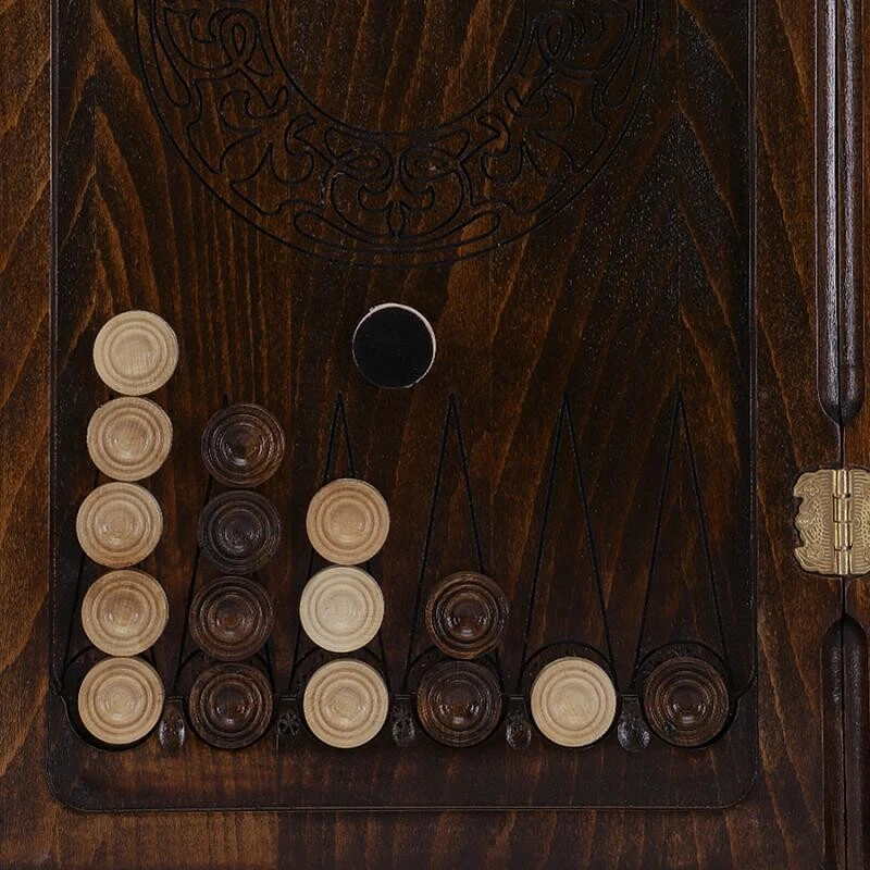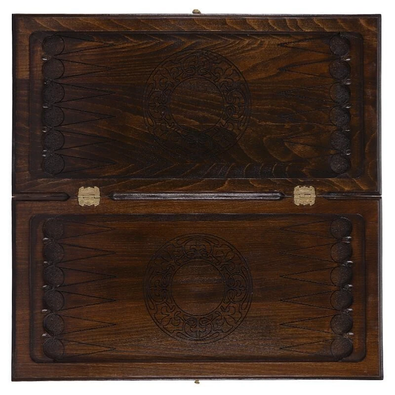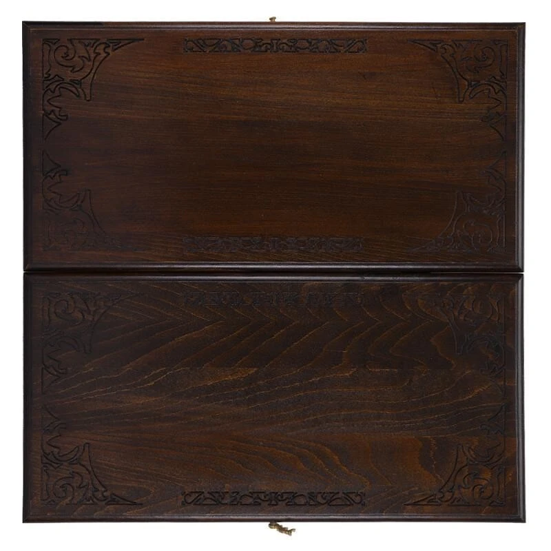Верхняя часть доски украшена не очень большим, но изящным резным узором. Декоративная отделка позволяет насладиться красотой натуральной фактуры и оттенков древесины. Внутренний разворот доски представляет собой поле для нард, которое тоже украшено красивым орнаментом.