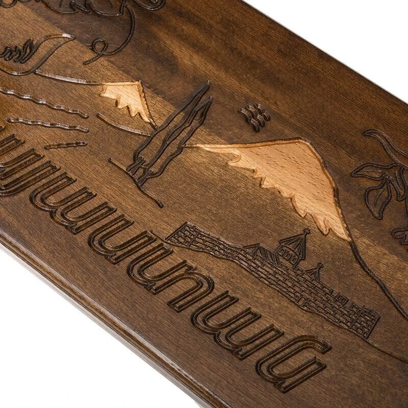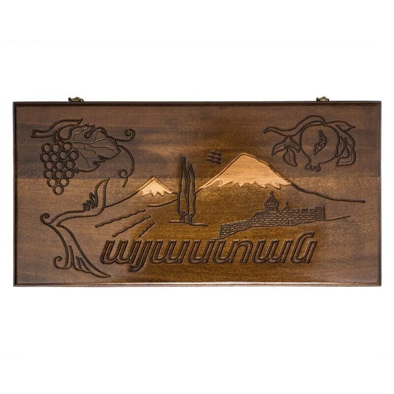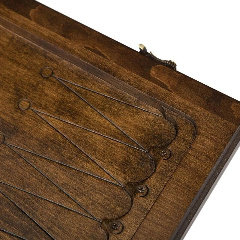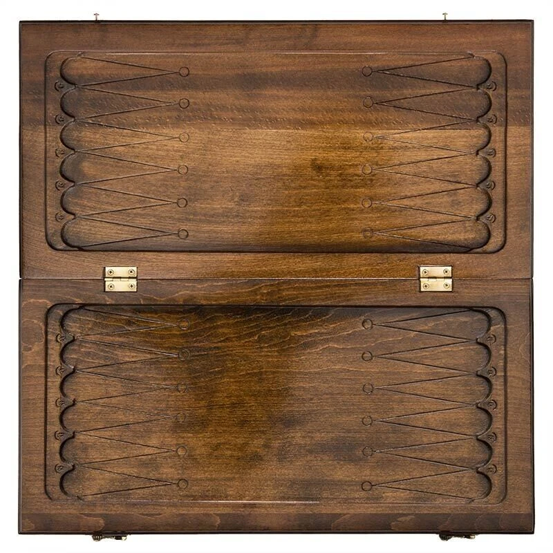 Сама доска изготовлена из прочной древесины, которая точно прослужит долгое время. Она покрывается слоем лака, который защищает от влажности и трещин, а дополнительно придает блеска. На внешней стороне вырезан красивый рисунок, причем – полностью ручным способом, с применением простейших инструментов. Для тех, кто любит игры попроще предусмотрено поле для шашек, в которые можно играть при помощи комплектных фишек. В комплекте также имеется чехол, который поможет обезопасить доску от налипания грязи во время переноса.