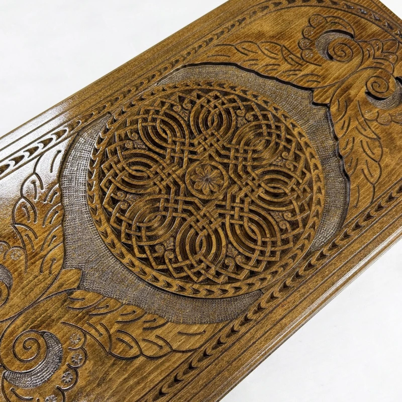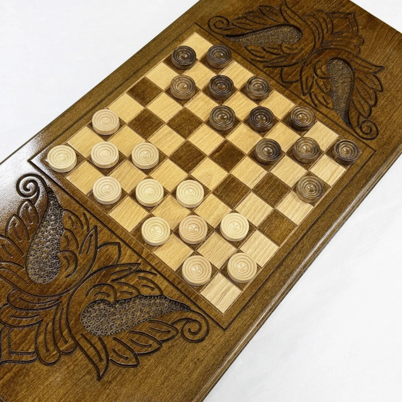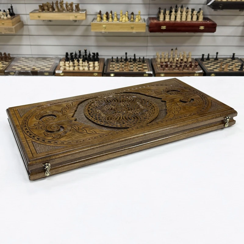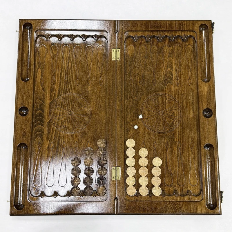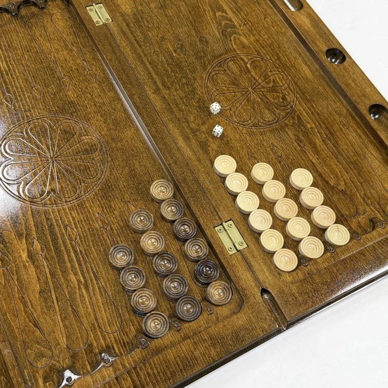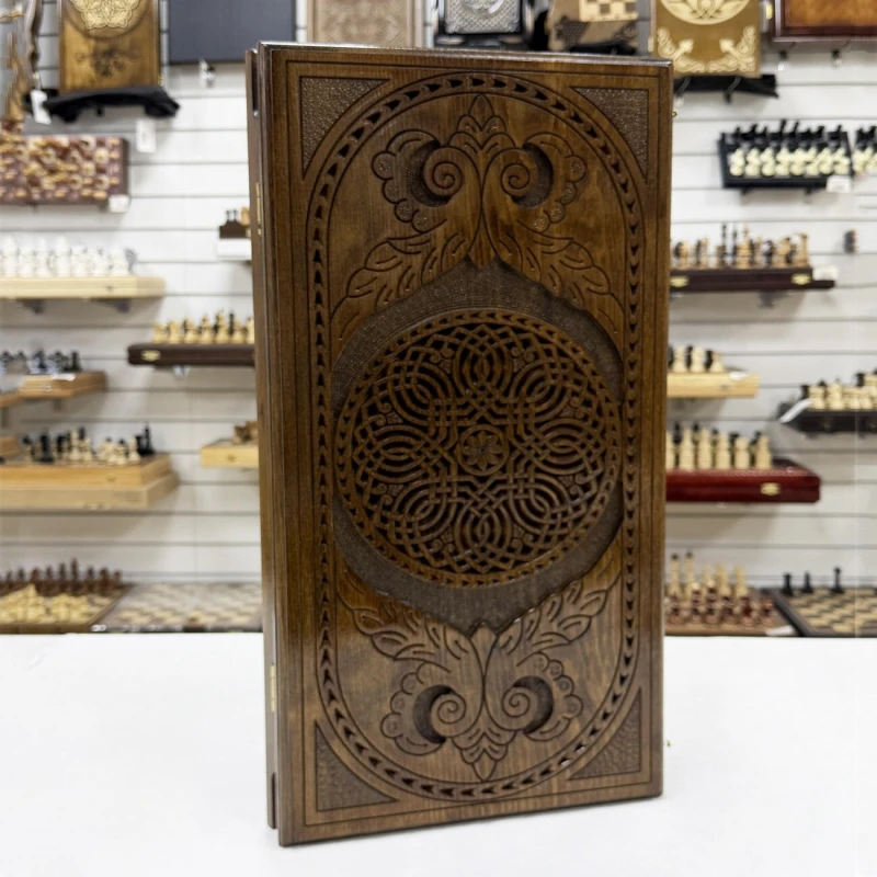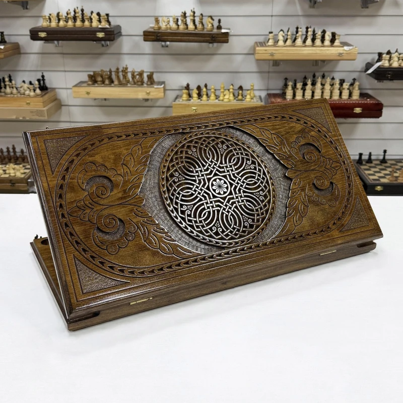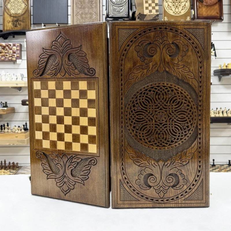 Эксклюзивные нарды- Орнамент 2, выполненные из массива бука, представляют собой настоящую работу искусства ручной работы. Длина 60 см делает их идеальными для комфортной игры как дома, так и в поездках. Каждая доска уникальна благодаря натуральной текстуре дерева, а тщательная обработка и лаковая отделка придают нардам элегантный вид и защиту от износа. На внешней стороне -изображение рисунка Бесконечность. На обратной стороне -поле для шашек. В комплекте идут фишки и кости. Игра на таких нардах станет не только увлекательным времяпрепровождением, но и эстетическим наслаждением, благодаря гармонии формы и материала.