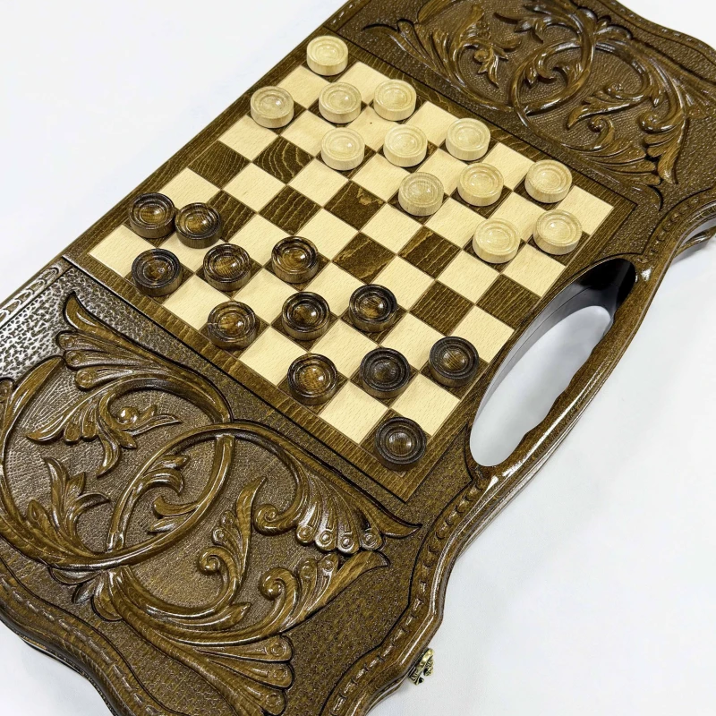 Эксклюзивные нарды- Восточный цветок с ручкой, выполненные из массива бука, представляют собой настоящую работу искусства ручной работы. Длина 60 см делает их идеальными для комфортной игры как дома, так и в поездках. Каждая доска уникальна благодаря натуральной текстуре дерева, а тщательная обработка и лаковая отделка придают нардам элегантный вид и защиту от износа. На внешней стороне -изображение герба и удобная ручка выполненная из массива. На обратной стороне -поле для шашек. В комплекте идут фишки и кости. Игра на таких нардах станет не только увлекательным времяпрепровождением, но и эстетическим наслаждением, благодаря гармонии формы и материала.