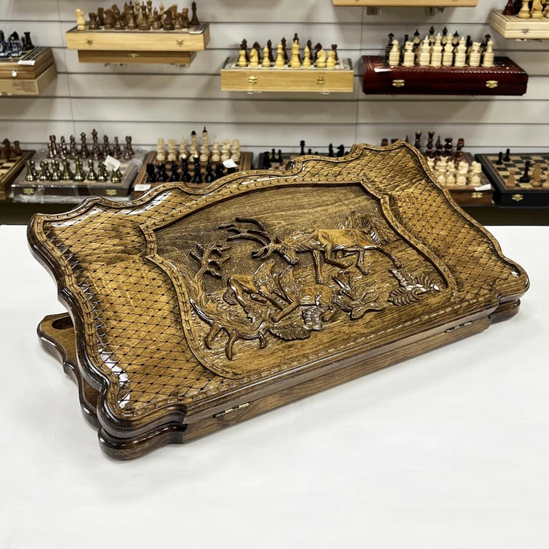 Большие эксклюзивные нарды ручной работы из массива бука Волк и Олень. Размер доски в разложенном виде 64 на 64 см. Размер доски в сложенном виде 64 на 32 см. На обратной стороне доски есть поле для шашек. В комплекте игральные кости и фишки для нард. Фишки сделаны из бука с подклейкой, в наборе 32 шт. Нарды ручной работы. Упакованы в чехол для транспортировки. Подойдут в подарок для взрослых и детей. Уникальный резной рисунок, Отличный подарок для ценителей качественных нард.