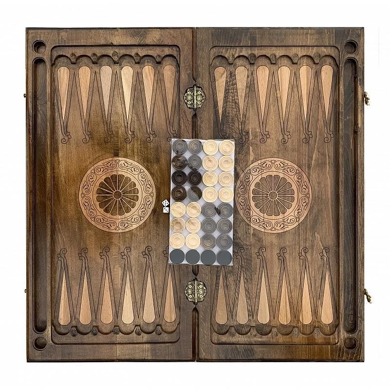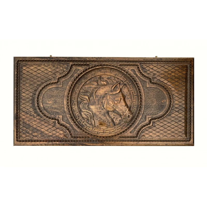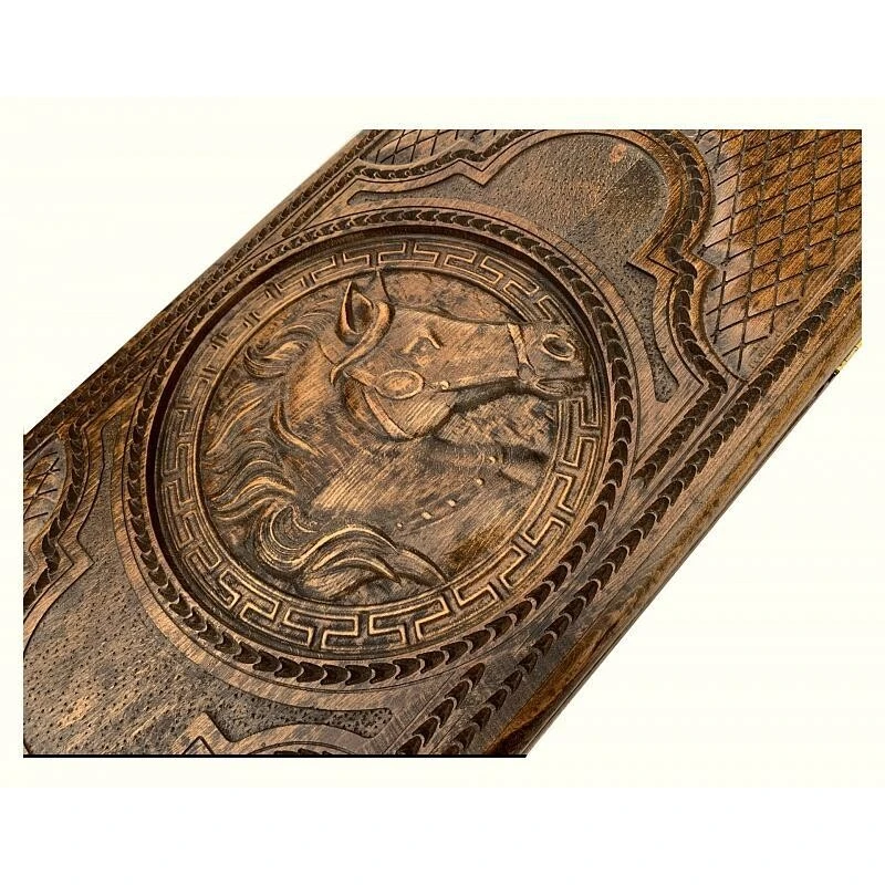 Что в коробке? 16 белых и 16 черных фишек; 2 игральные кости; Доска; Защитный чехол. Коллекционные деревянные нарды «Лошадь» - красивый подарочный набор классической настольной игры, изготовленный вручную одним из самых талантливых мастеров современности. Удобный и практичный, он достойно пополнит собой коллекцию настолок и будет радовать долгие годы. Внешняя фасадная часть игральной доски декорирована резным фактурным рисунком лошади, который не только привлекателен на вид, но и приятен тактильно. Внутри – поле для игры в нарды, украшенное витиеватыми узорами. Также на доске есть поле для шашек. Надежность обеспечивается защитным глянцевым лаком и износостойкой медной фурнитурой.