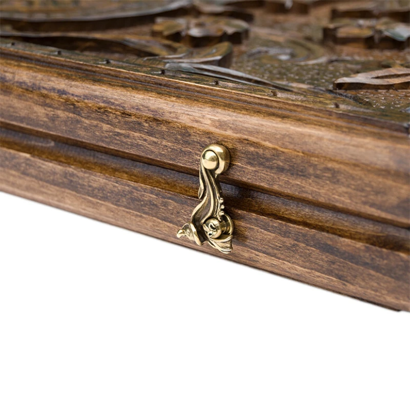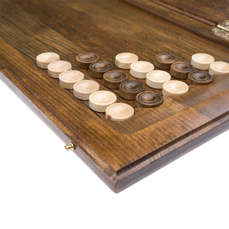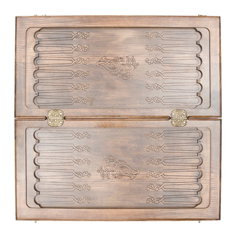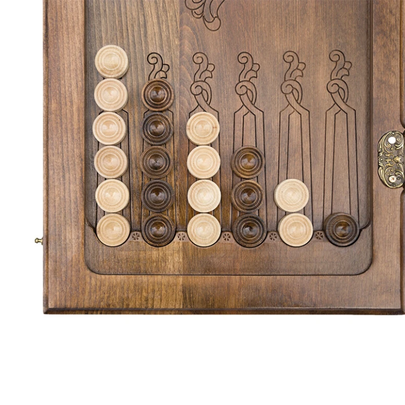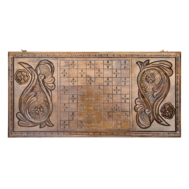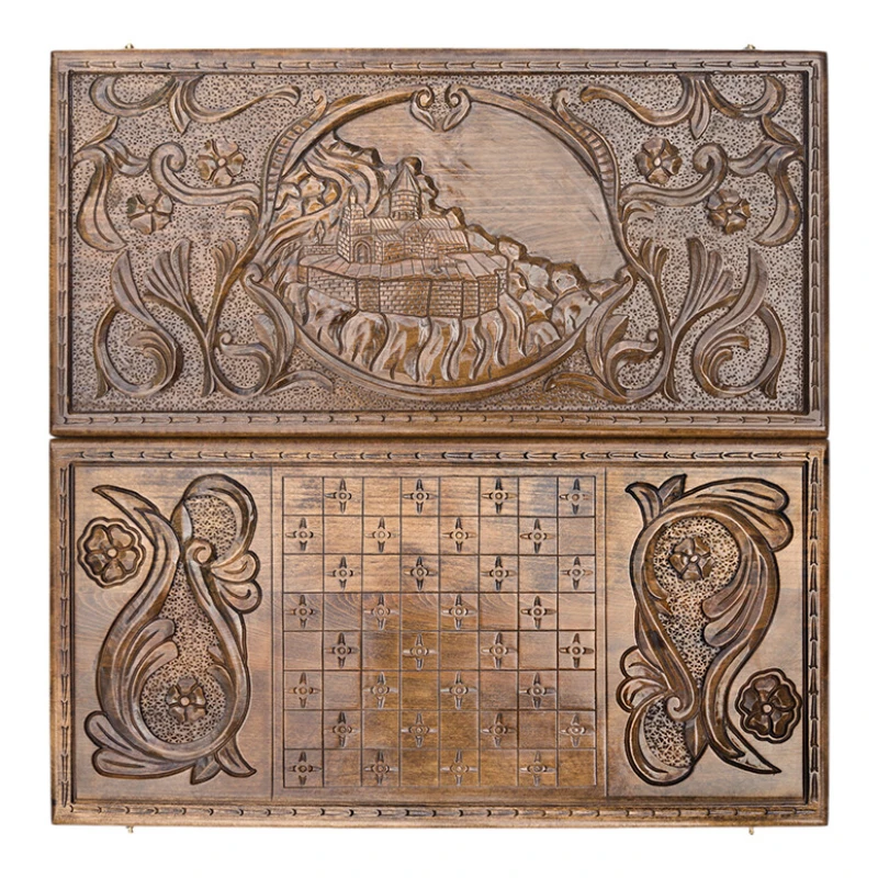 Резные нарды «Монастырь в горах» - одна из самых известных работ популярного армянского мастера. Она давно завоевала заслуженную популярность и по праву считается одной из лучших моделей подарочных нард. Доска сделана из массива орехового дерева. Резьба, осуществленная вручную, защищена лаковым покрытием. Фурнитура для скрепления изготовлена из меди – металла, не подверженного ржавению. Также защищена и каждая фишка – специальная подложка предотвращает вероятность царапания доски.