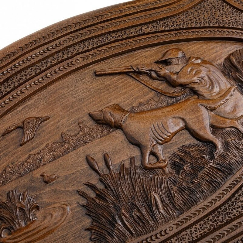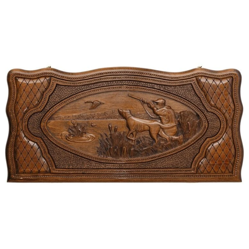 Также на игровой доске предусмотрено поле для шашек, что позволяет расширить ассортимент игр. Размер нард составляет 60 см, а вес - 4.2 кг, что делает их очень удобными для игры, и понравится людям которые не любят настольные игры маленьких размеров. Нарды резные "Охота" - это отличный выбор для любителей настольных игр, которые ценят качество и стильный дизайн.