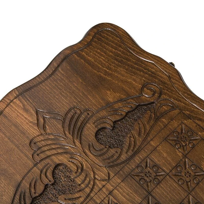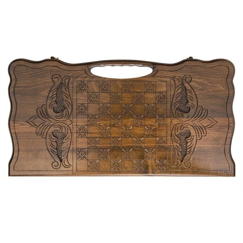 Для украшения здесь используется целая картина – двое охотников с копьями, в лесах Армении, охотятся на огромного медведя. Детализация поражает и ничуть не уступает современной лазерной резьбе. Есть поле для шашек, которые позволят отдохнуть, когда голова устанет от напряженных партий в нарды.