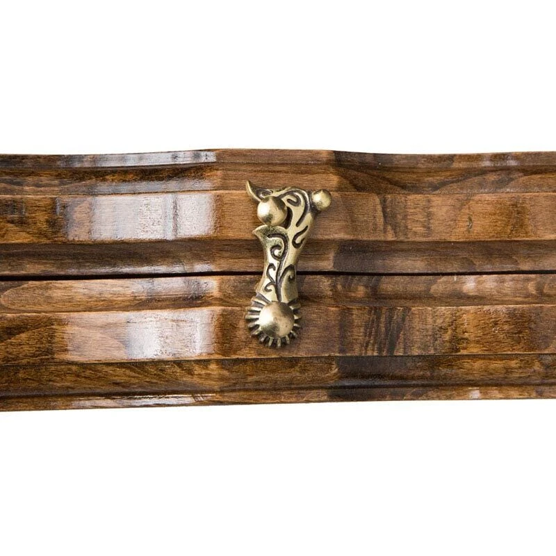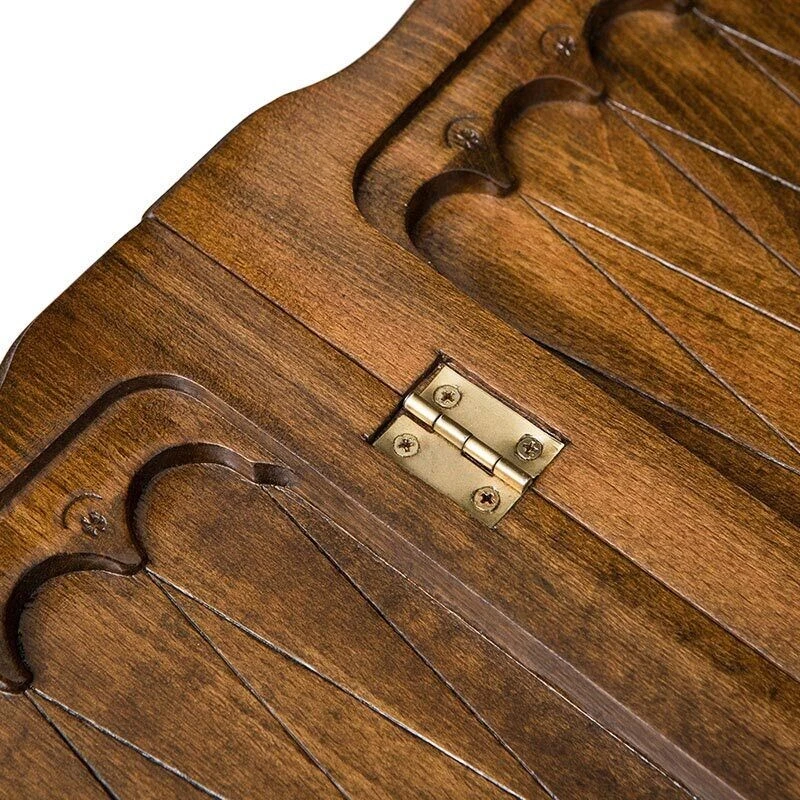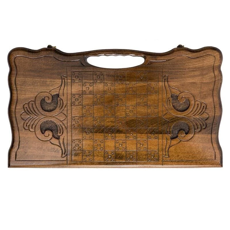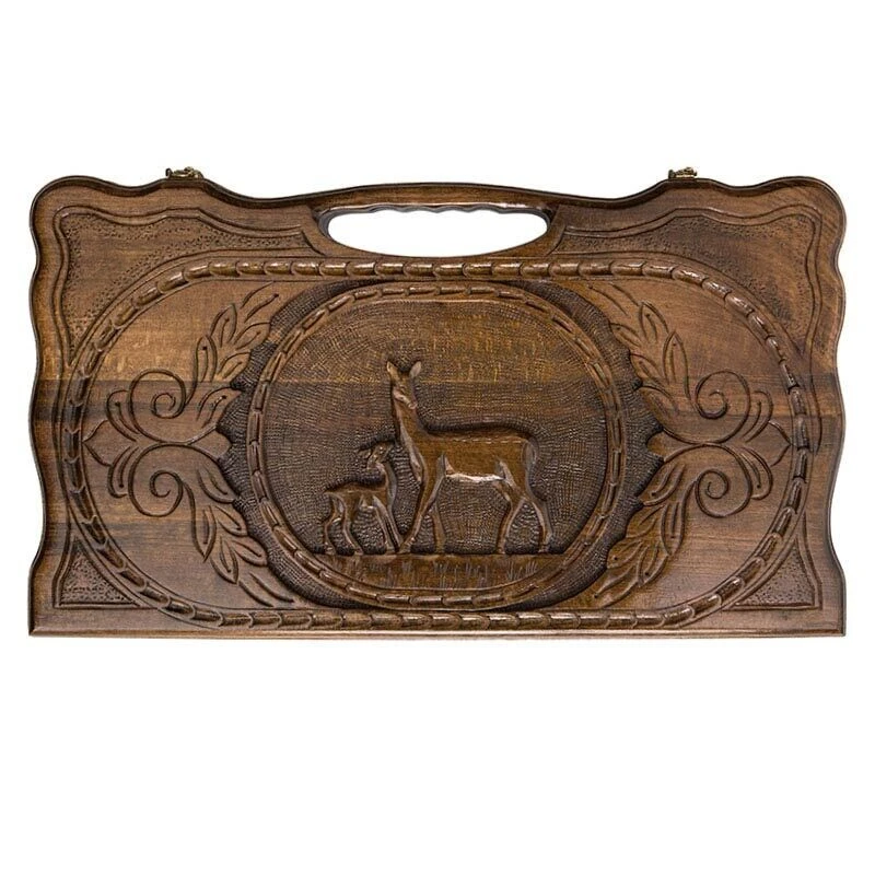 Карен Халеян известен тем, что он украшает свои детища различными резными композициями. В этом случае была выбрана картина, где самка оленя гордо стоит рядом со своим малышом. Все это дополнительно украшено резкой, придающих целостности. На второй створке разлиновано поле, позволяющее играть в обычные шашки. Крючки из бронзы тоже не простые – прямо на металл нанесен узор, что придает им уникальности. Кстати петли также бронзовые и точно прослужат долго, независимо от того, насколько часто вы будете открывать и закрывать доску.