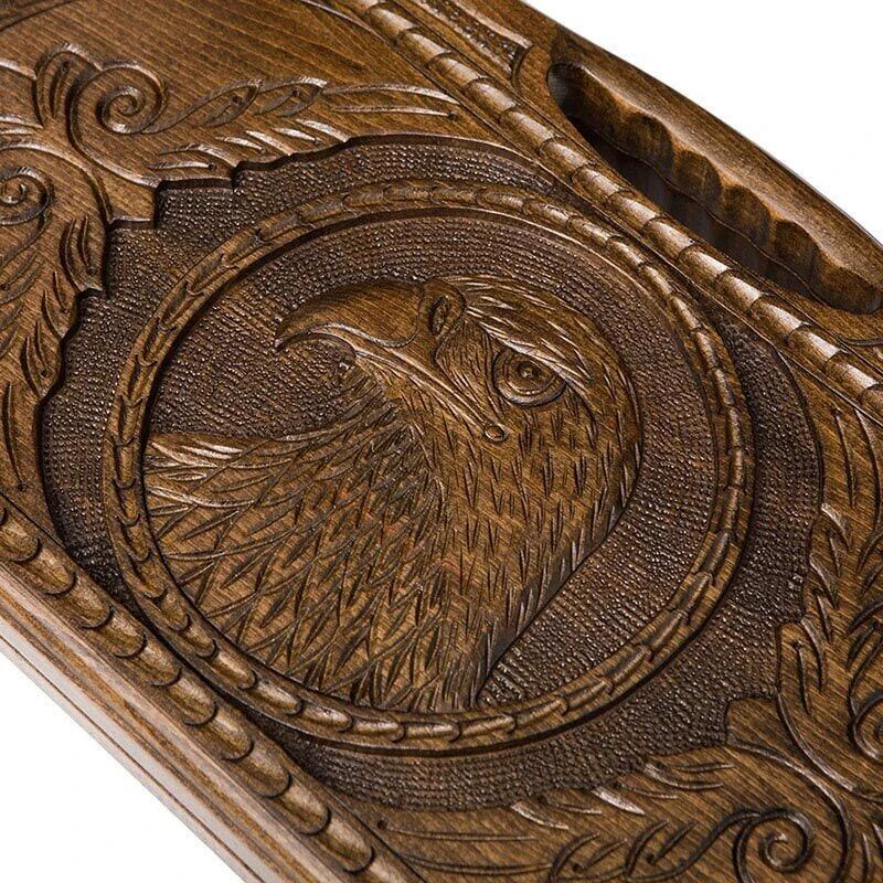 С обратной стороны доски, вырезана голова орла, причем в настолько мельчайших подробностях, что кажется, будто он сейчас оживет. Повсюду нанесены интересные восточные узоры, что придает еще больше «богатства» нардам резным Орел от известного мастера. Также здесь есть поле для игры в шашки, чтобы вы могли отвлечься от нард.