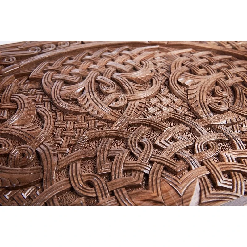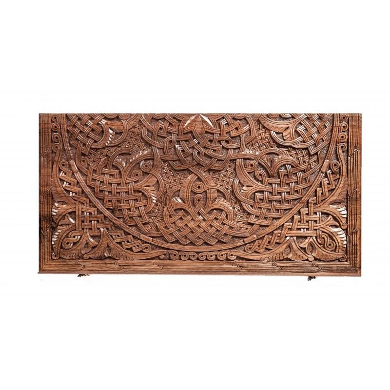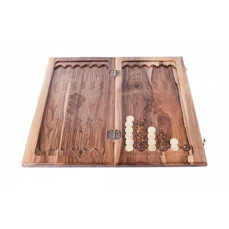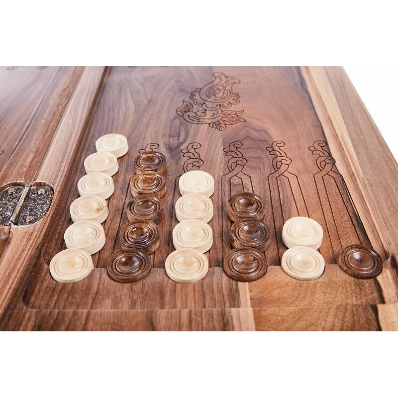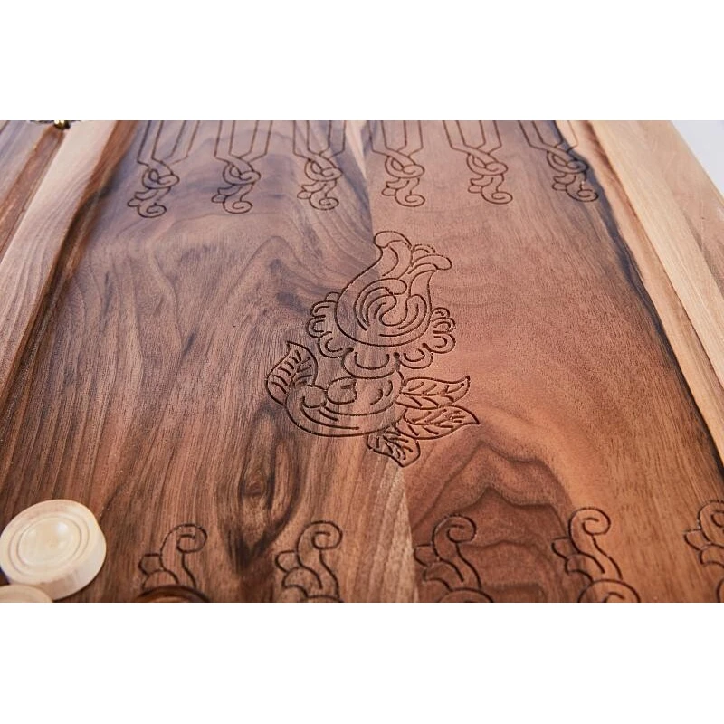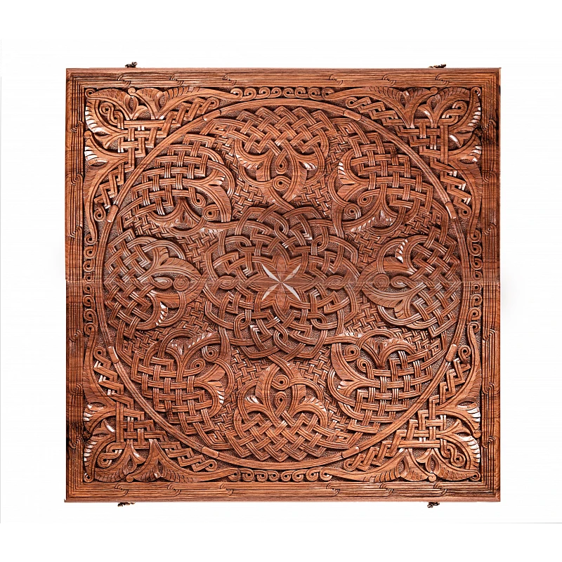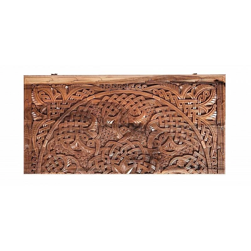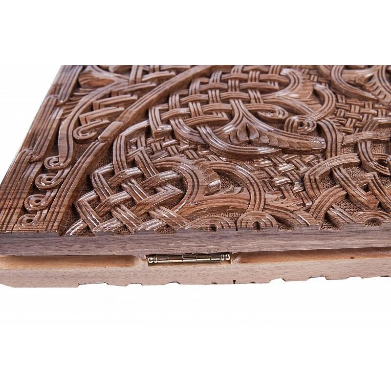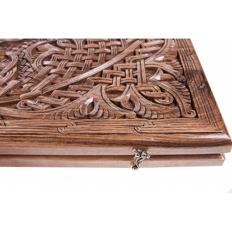 Особенностью нард резных «Орнамент 3» с цельным рисунком» является то, что узор с одной створки плавно перетекает на другую. В открытом виде создаётся цельная картина, что является заслугой мастера из Армении Давида Мхитаряна. Это полностью ручная резьба, выполненная с вниманием к мельчайшим деталям, благодаря чему и достигается настолько интересный внешний вид. Материалом служит прочный ореховый массив, который гарантирует срок службы не менее 5 лет, даже при каждодневных партиях. За удержание створок между собой отвечают петли и крючки из чистой бронзы. Внутри изготовитель специально оставил древесную структуру, дополнительно подчеркнув её лакированным покрытием. Чтобы безопасно хранить или перевозить такую красоту, в комплекте есть чехол.