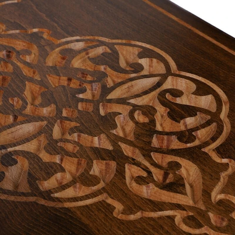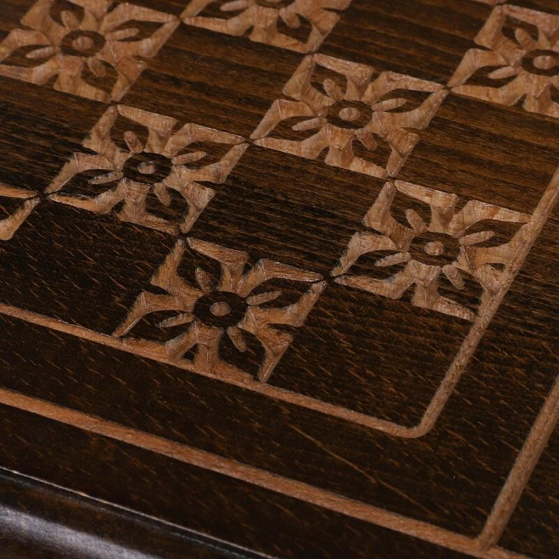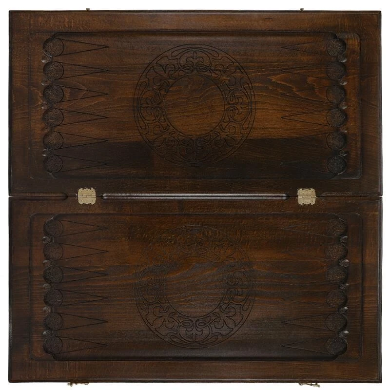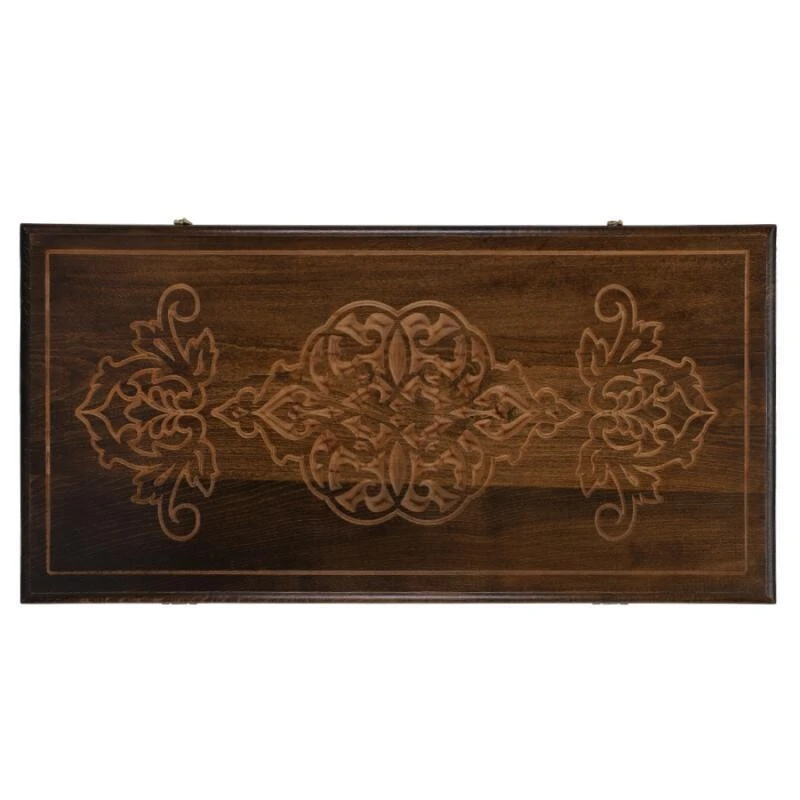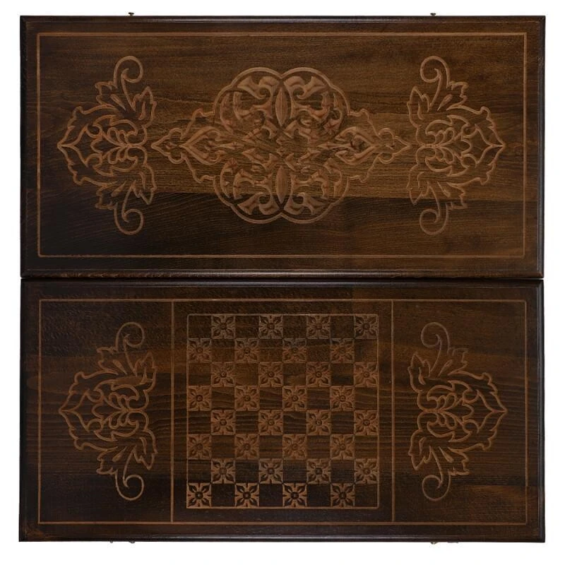Верхняя крышка доски украшена оригинальными резными узорами, складывающимися в единую гармоничную композицию. На задней крышке помимо узоров нанесено поле для игры в шашки или шахматы. Внутренняя сторона доски полностью отведена под поле для нард.