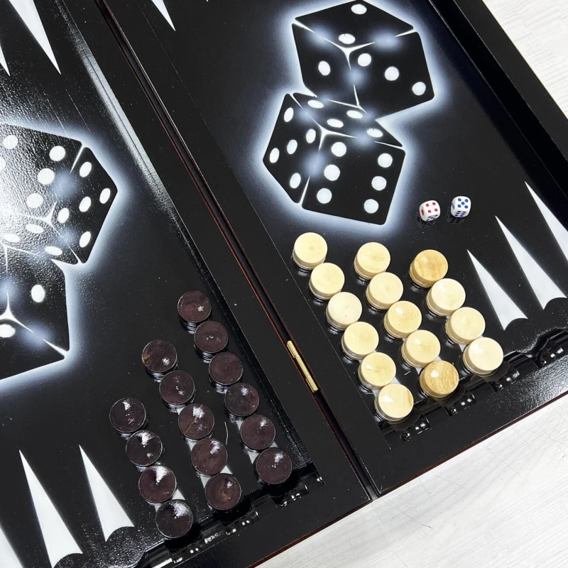 Деревянные нарды ручной работы из массива дерева. В комплекте игральные кости и фишки для нард с подклейкой. Размер доски в разложенном виде 55 на 55 см. Внутри доски рисунок игральных костей. Сделаны в России. Подойдут для игры в длинные и короткие нарды.
