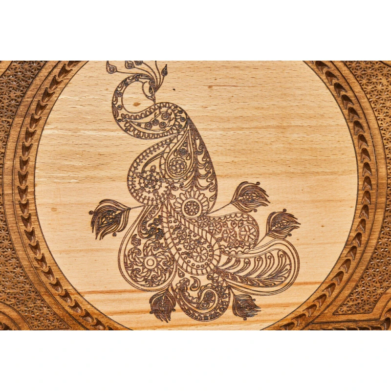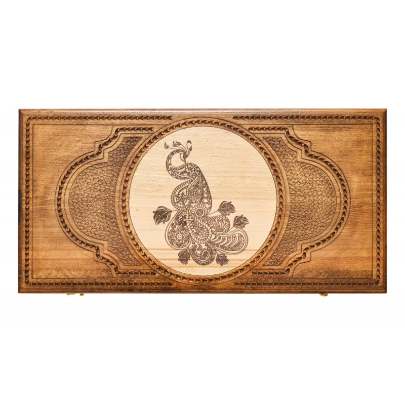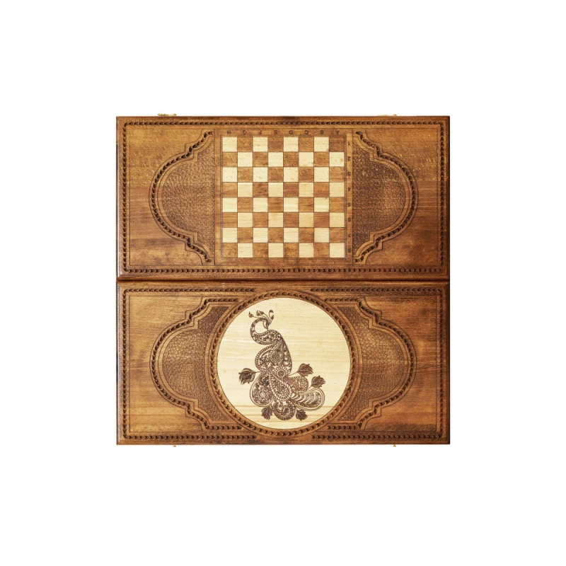 Что в коробке? 32 фишки; 2 шестигранных кубика; Доска; Чехол. Набор резных нард «Павлин», изготовленных из натуральной древесины – подарочный вариант классической настольной игры, который будет рад иметь в своей коллекции каждый поклонник этого развлечения. Изделие изготовлено в технике маркетри одним из самых известных в нашей стране мастеров и порадует не только дизайном, но и долговечностью. Доска с внешней фасадной стороны декорирована фактурным изображением павлина и абстрактным узором. На обратной стороне нанесено поле для шашек, а внутри – для нард. Каждый элемент набора покрыт защитным глянцевым лаком. Кроме того, от образования царапин игровую поверхность защитят подложки на каждой фишке.