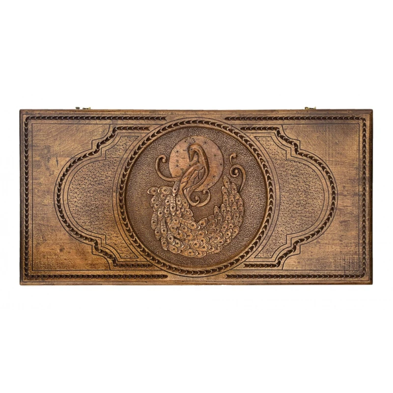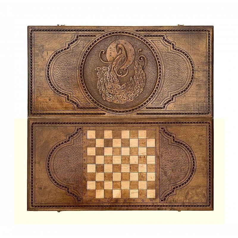 Что в коробке? 16 светлых фишек; 16 темных фишек; 2 шестигранных кубика; Доска; Чехол. Подарочная модель нард «Павлин», сделанная из натуральной древесины– элитный экземпляр классической настольной игры, способный стать достойным пополнением любой коллекции настолок. Декорированная в технике маркетри, доска с фасадной внешней стороны украшена фактурным изображением павлина. Задняя внешняя часть имеет поле для шашек. Части доски скреплены между собой надежными медными петлями. На каждой фишке в комплекте прикреплена подложка, благодаря которой игровая поверхность не будет царапаться, повреждаться.