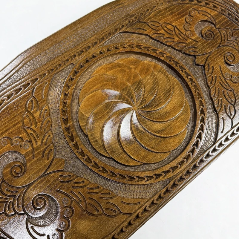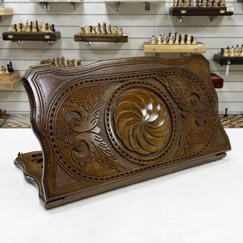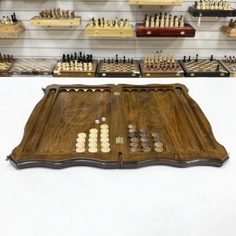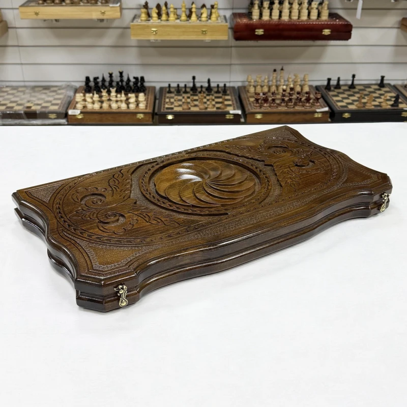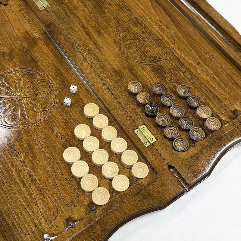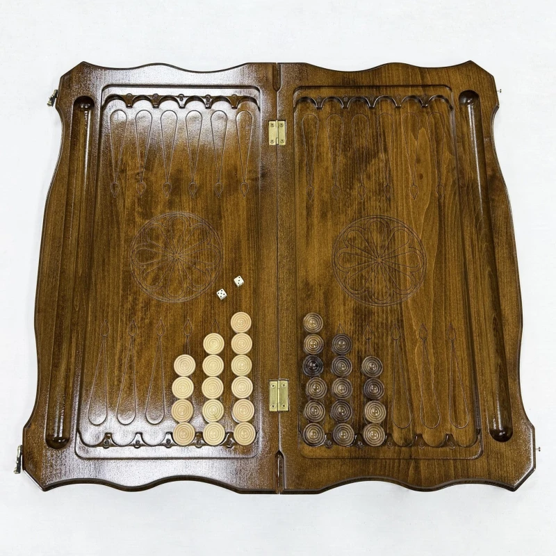 Эксклюзивные нарды, выполненные из массива бука, представляют собой настоящую работу искусства ручной работы. Длина 60 см делает их идеальными для комфортной игры как дома, так и в поездках. Каждая доска уникальна благодаря натуральной текстуре дерева, а тщательная обработка и лаковая отделка придают нардам элегантный вид и защиту от износа. На внешней стороне -изображение рисунка Бесконечность. На обратной стороне -поле для шашек. В комплекте идут фишки и кости. Игра на таких нардах станет не только увлекательным времяпрепровождением, но и эстетическим наслаждением, благодаря гармонии формы и материала.