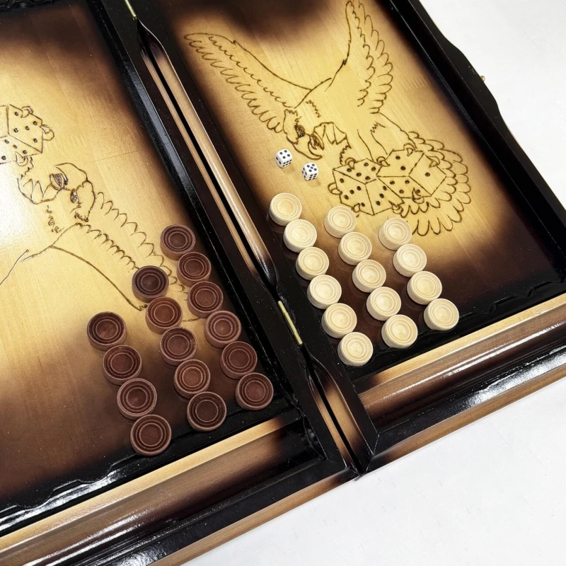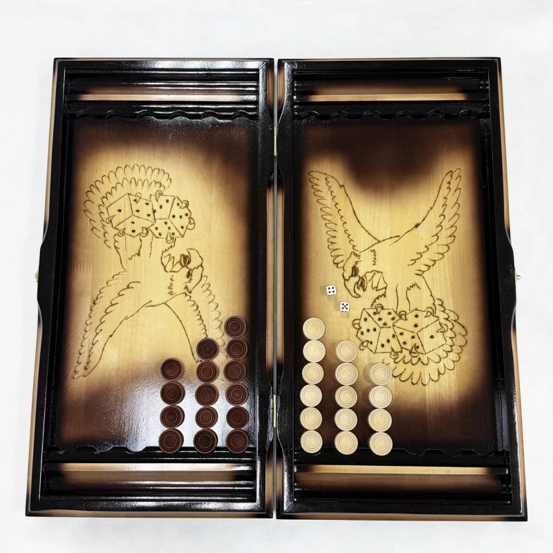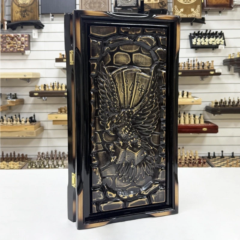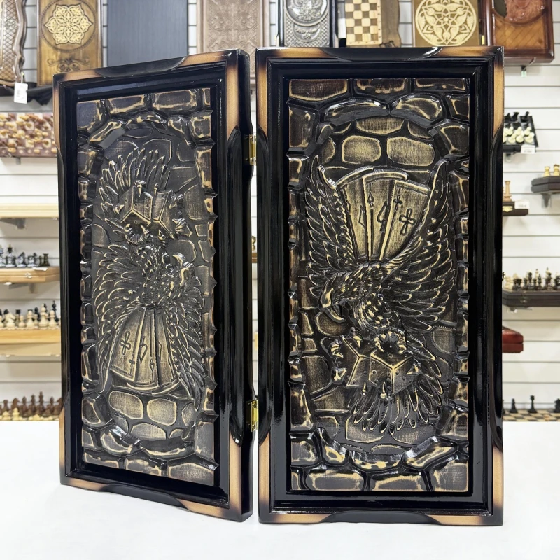 Эти нарды отличаются уникальным дизайном: резной рисунок рисунок и орнамент Беркута, что придает изделию современный и стильный вид. Высококачественные материалы гарантируют долговечность и прочность, а также приятные тактильные ощущения во время игры. В комплект входят фишки (32 шт.) и кости - 2 шт. Сделано в России.