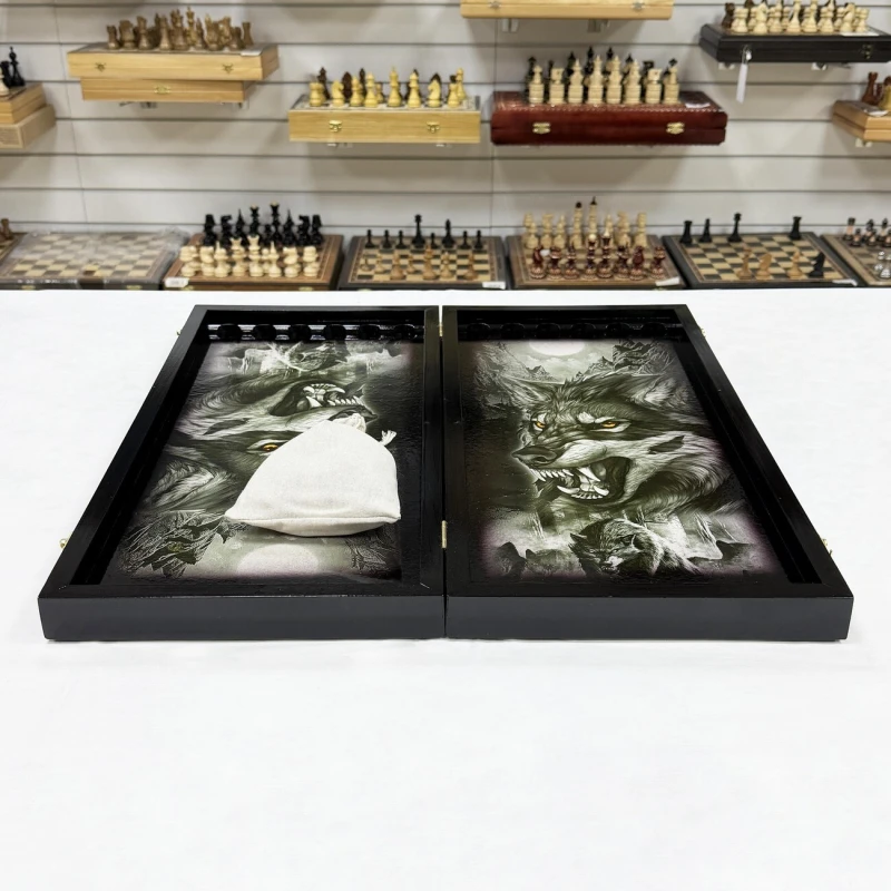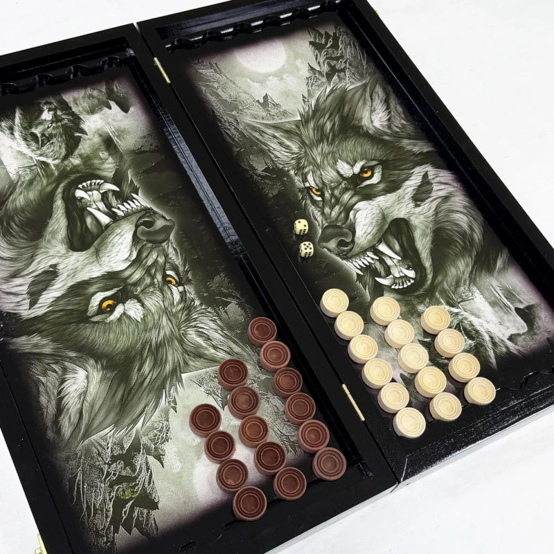 Эти нарды отличаются уникальным дизайном: резной рисунок рисунок и орнамент волка, что придает изделию современный и стильный вид. Высококачественные материалы гарантируют долговечность и прочность, а также приятные тактильные ощущения во время игры. В комплект входят фишки (32 шт.) и кости - 2 шт. Сделано в России.