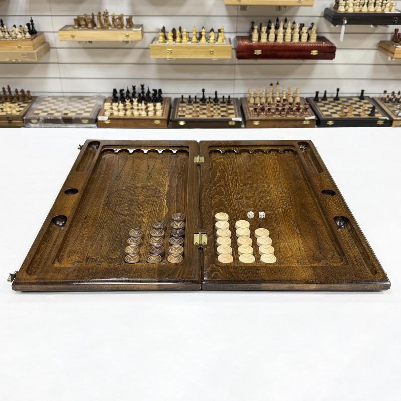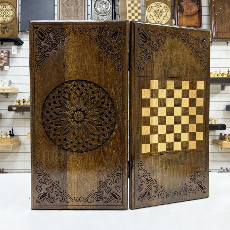 Эксклюзивные нарды, выполненные из массива бука, представляют собой настоящую работу искусства ручной работы. Длина 60 см делает их идеальными для комфортной игры как дома, так и в поездках. Каждая доска уникальна благодаря натуральной текстуре дерева, а тщательная обработка и лаковая отделка придают нардам элегантный вид и защиту от износа. На внешней стороне -изображение цветочного орнамента. На обратной стороне -поле для шашек. В комплекте идут фишки и кости. Игра на таких нардах станет не только увлекательным времяпрепровождением, но и эстетическим наслаждением, благодаря гармонии формы и материала.