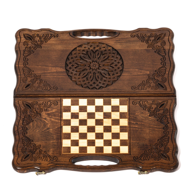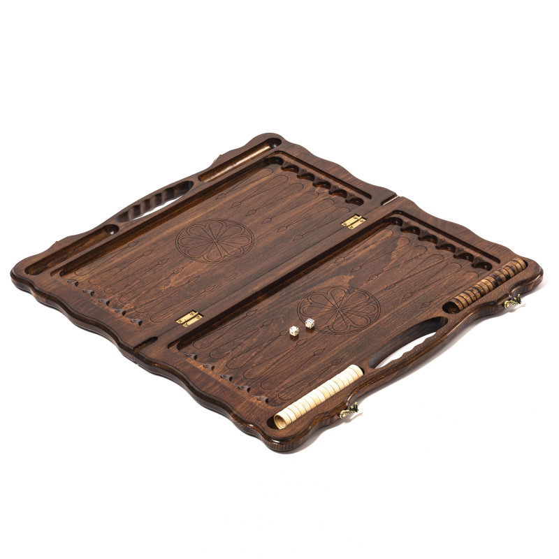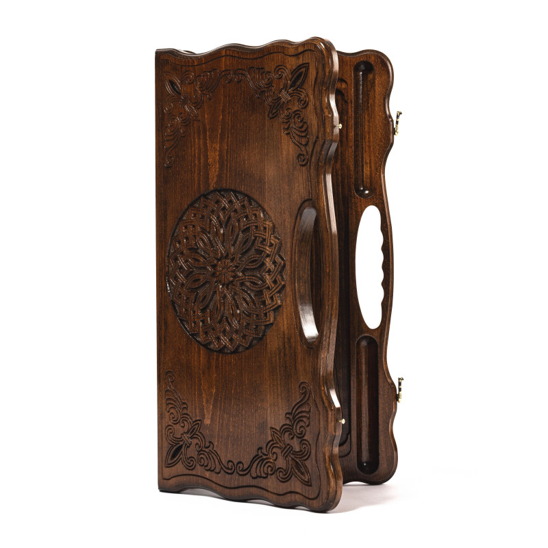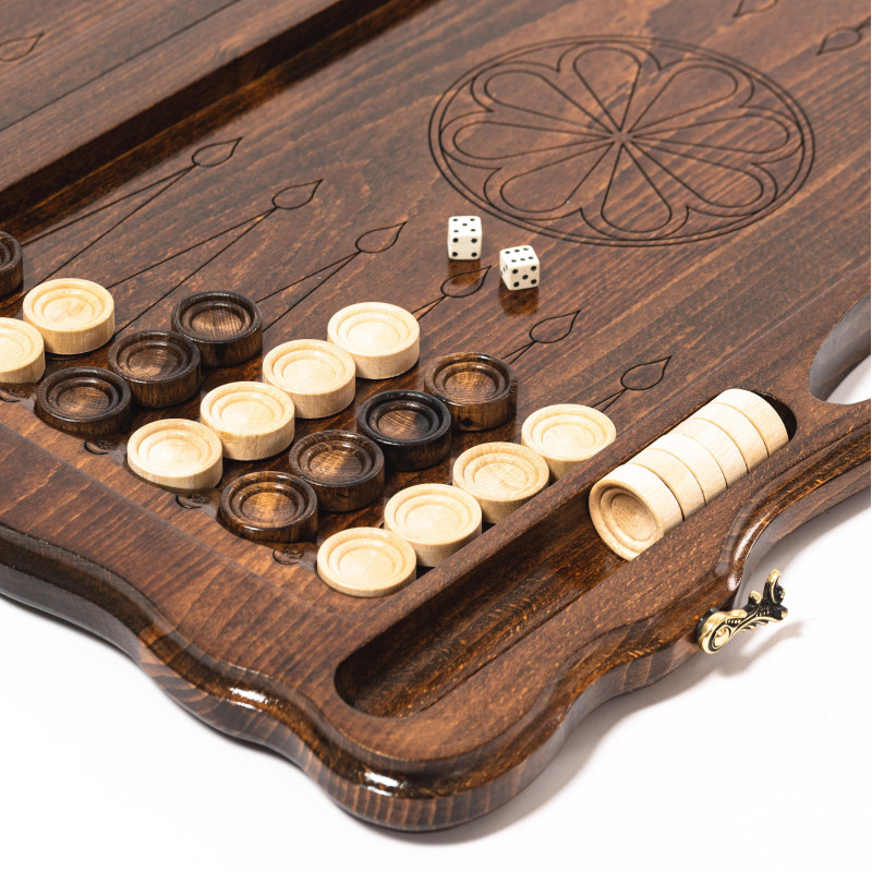 Классические нарды, выполненные из массива бука, представляют собой настоящую работу искусства ручной работы. Длина 60 см делает их идеальными для комфортной игры как дома, так и в поездках. Каждая доска уникальна благодаря натуральной текстуре дерева, а тщательная обработка и лаковая отделка придают нардам элегантный вид и защиту от износа. На внешней стороне -изображение замысловатого узора, на верху ручка для удобного переноса нард. На обратной стороне -поле для шашек. В комплекте идут фишки и кости. Игра на таких нардах станет не только увлекательным времяпрепровождением, но и эстетическим наслаждением, благодаря гармонии формы и материала.