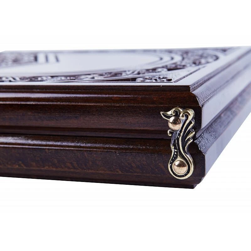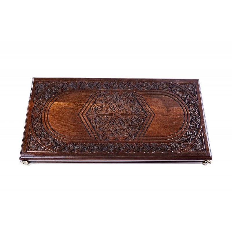 Резные нарды «Шестигранный узор» - эксклюзивная ручная работа известного армянского мастера. Подарочный набор из двух традиционных настольных игр – нард и шашек, поле для которых расположено на оборотной внешней стороне. Доска, сделанная из натурального массива бука, скреплена надежными и износостойкими бронзовыми петлями, поэтому о ее долговечности можно не беспокоиться. Кроме того, каждая из фишек в комплекте имеет подложку, призванную защищать доску от царапания во время игры. Также в комплект входит пара костей.