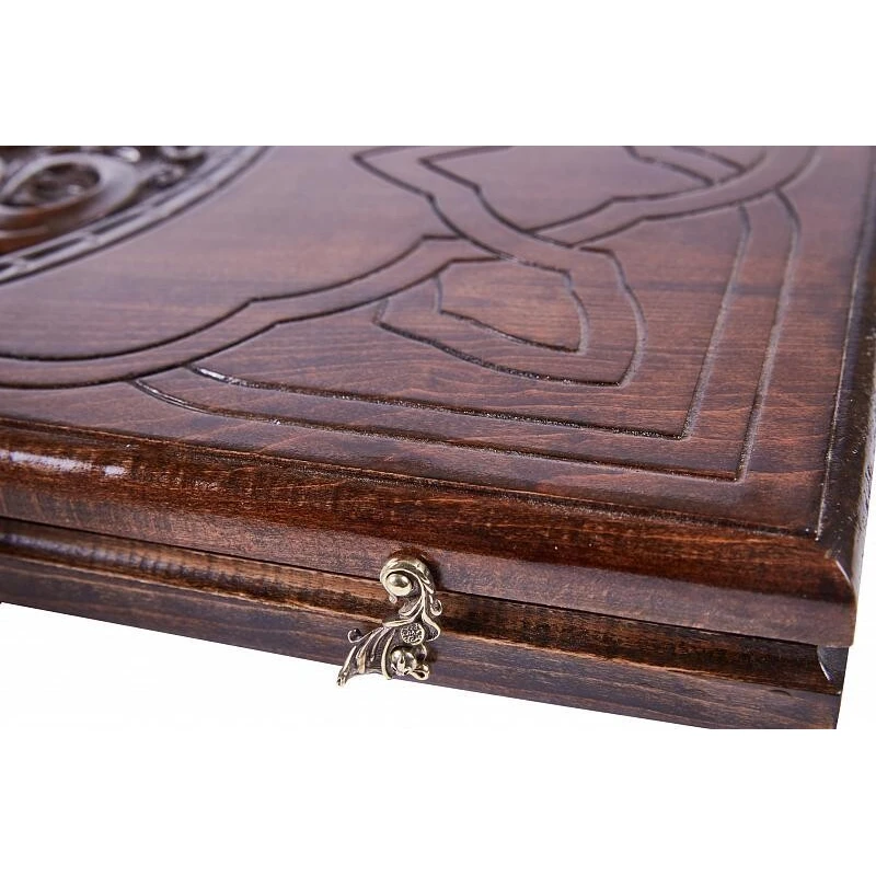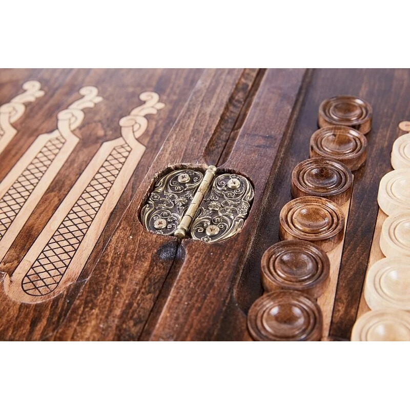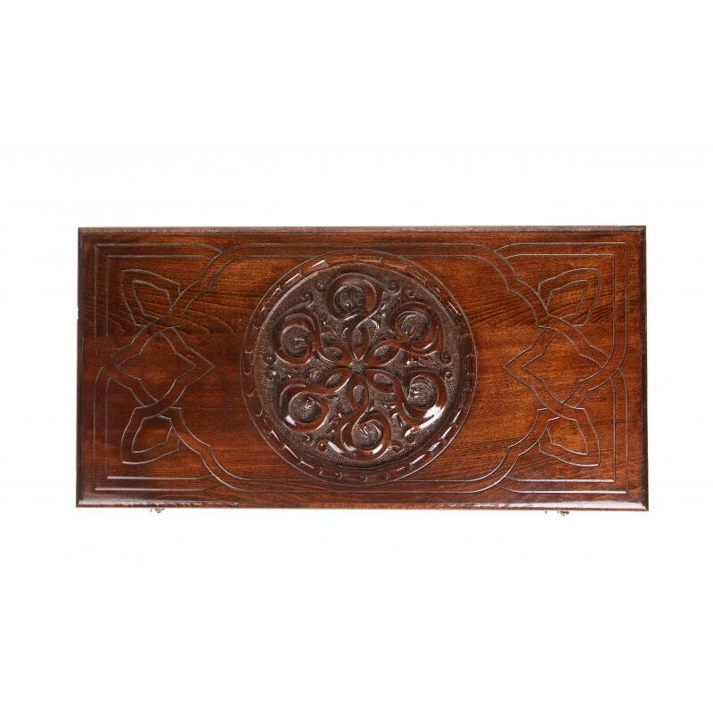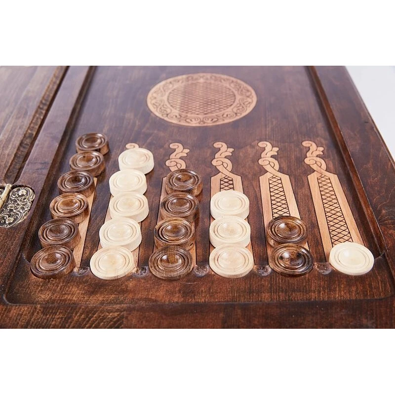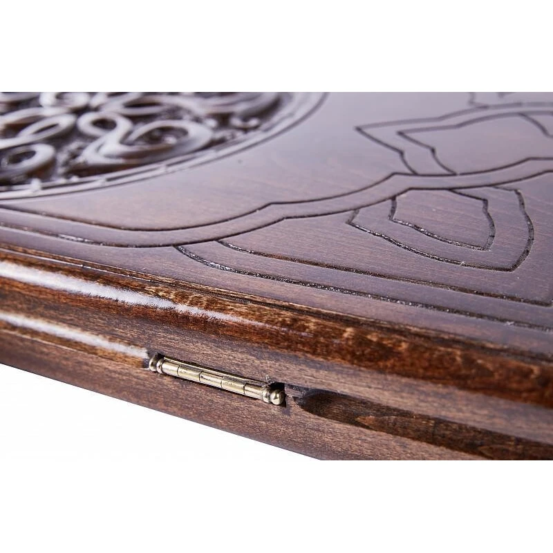 Уже при первом взгляде на нарды резные «Сияние 2» видно, что данное изделие создавалось истинным мастером. Оно сделано в Армении руками Давида Мхитаряна из бука. Этот материал выбран благодаря своей высокой прочности и практически безграничной долговечности, к тому же, на нём легко выполнять резьбу. Для украшения был выбран необычный узор, который напоминает солнце с лучами или распустившийся цветок. Древесная фактура специально подчёркнута лаком, дополнительно защищающим изделие от влажности. На второй створке также вырезан узор, схожий с перепутанными лозами винограда. При транспортировке защитить доску поможет комплектный тканевый чехол.