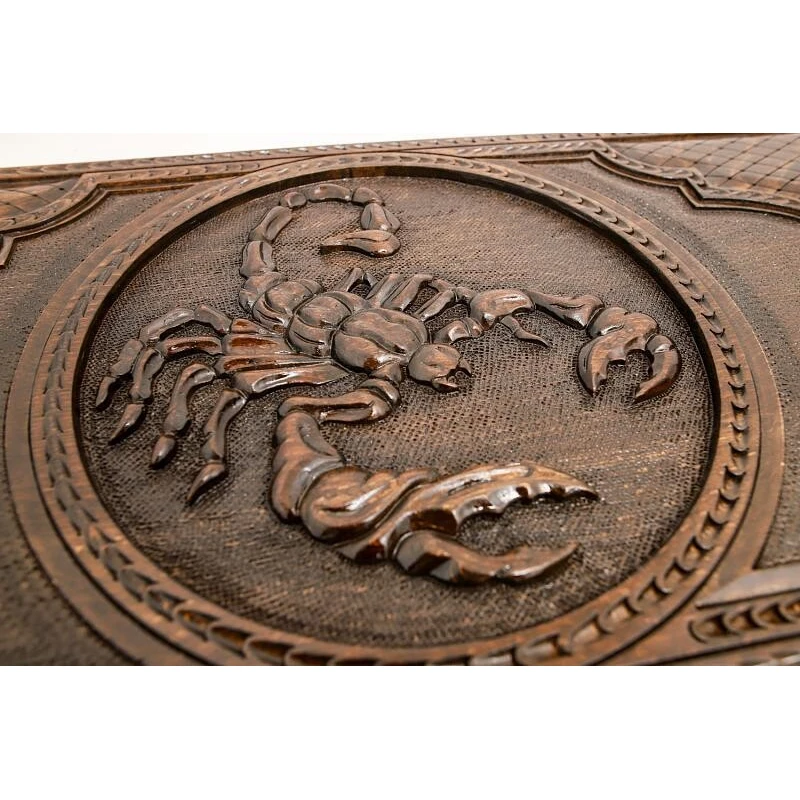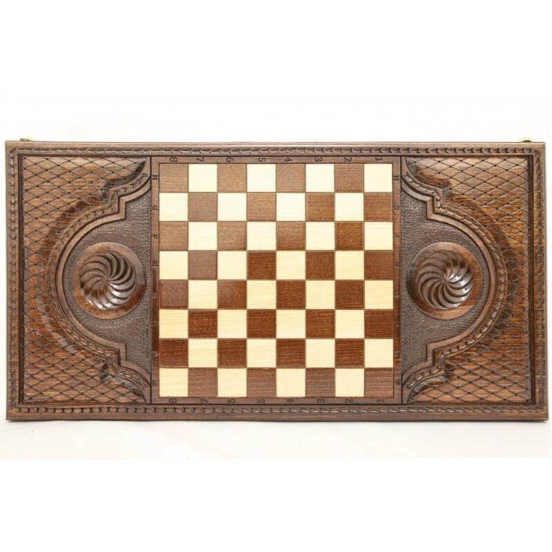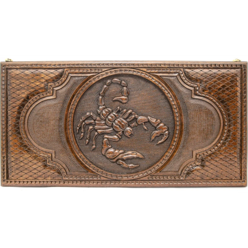 Что в коробке? 32 фишки; 2 игральные кости; игральная доска; защитный чехол. Изысканные резные нарды «Скорпион 1», автором которых является знаменитый армянский мастер – уникальный экземпляр классической настольной игры, который будет рад иметь в своей коллекции каждый поклонник этой игры. Изделие выполнено вручную из материалов высокого качества, поэтому порадует не только великолепным внешним видом, но и надежностью, долговечностью. Буковая древесина, из которой сделана доска, украшена абстрактными резными узорами и изображением скорпиона. На обратной внешней стороне также имеется поле для игры в шашки, и в комплекте есть для этого полный комплект фишек. Доска покрыта защитным лаком и дополнена износостойкой фурнитурой из натуральной меди.