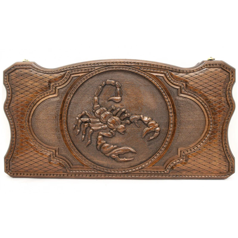 Что в коробке? Доска; Чехол; 2 шестигранных кубика; 32 фишки. Красивый и изящный подарочный набор резных нард «Скорпион 2» – прекрасный вариант пополнения домашней коллекции классических настолок или в качестве подарка. Комплект выполнен известным мастером в лучших традициях ручной резьбы по дереву – это настоящее произведение искусства. Доска сделана из натуральной древесины бука, покрытой защитным лаком. Ее части скреплены между собой износостойкой фурнитурой из настоящей меди. Крышку украшает абстрактный узор и скорпион, на обороте – поле для шашек. Внутренняя часть отведена под поле для нард, которое также украшено изящным узором.