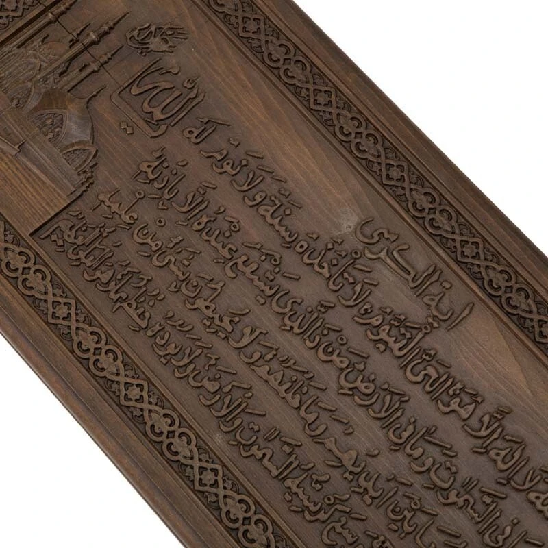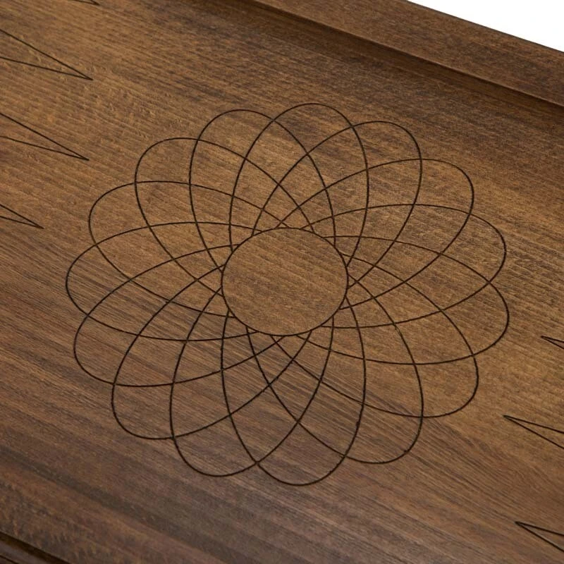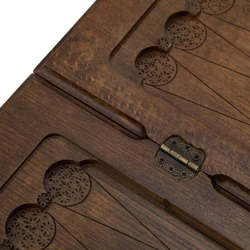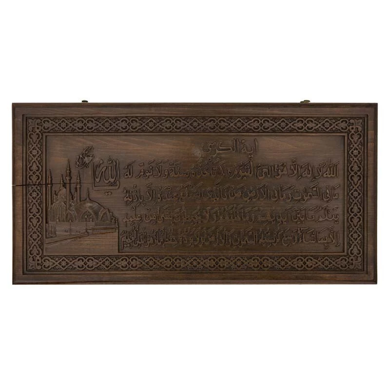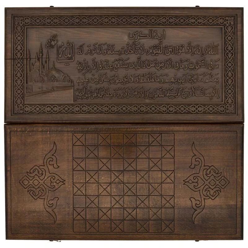 В качестве украшения на внешней стороне одной из створок выгравированы строки из Священного писания. Они находятся в окаймлении из восточного узора. На второй створке предусмотрено специальное поле для игры в шашки, для чего могут использоваться комплектные фишки. Внутри также все в узорах, даже каждая ячейка подчеркнута отдельно.