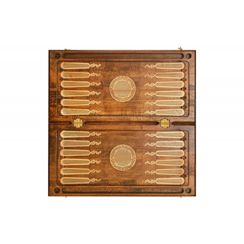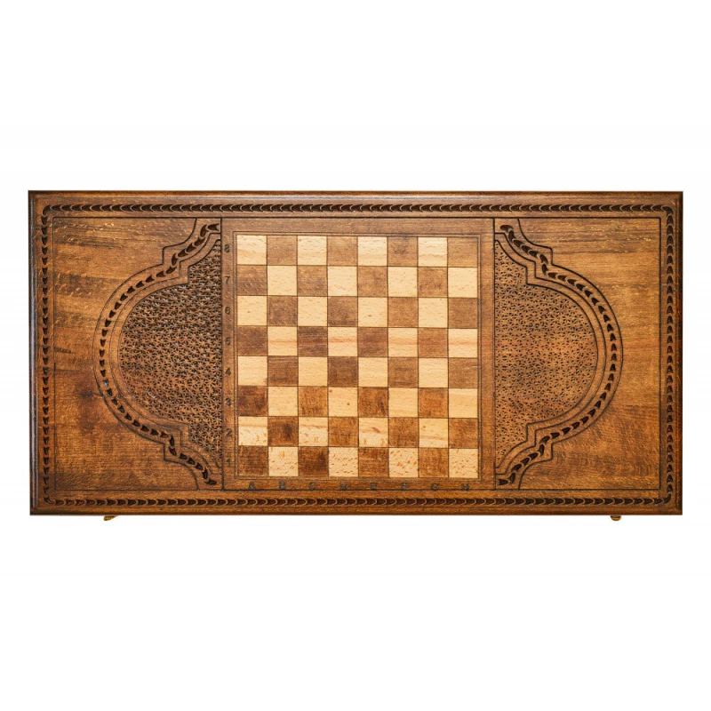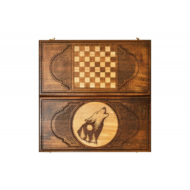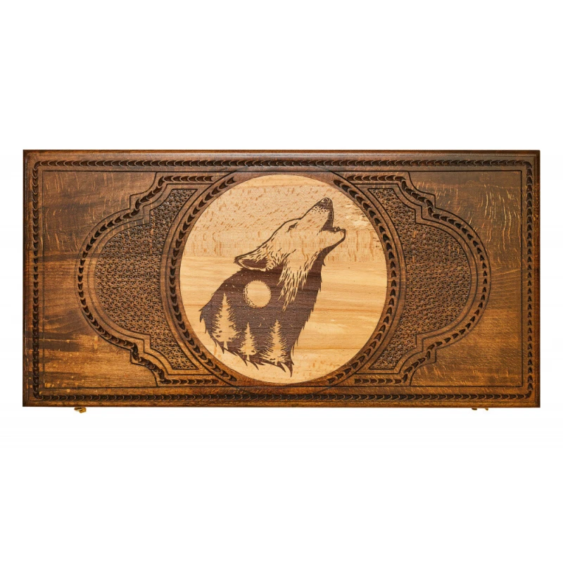 Что в коробке? 16 светлых фишек; 16 темных фишек; 2 игральные кости; Доска; Защитный чехол. «Волк» - подарочный набор резных нард из настоящей высококачественной древесины, изготовленный талантливым армянским мастером. Невероятно красивый и качественный игровой комплект станет настоящим украшением любой коллекции и будет радовать долгие годы. Доска украшена фактурным изображением волка, которое нанесено с помощью специального лазера, и витиеватым узором. Обратная сторона имеет поле для шашек, а внутренняя, тоже украшенная узорами – для нард. Фишки стандартной формы и размера удобно лежат в руке. На каждой из них прикреплена подложка, предотвращающая царапание игровой поверхности.