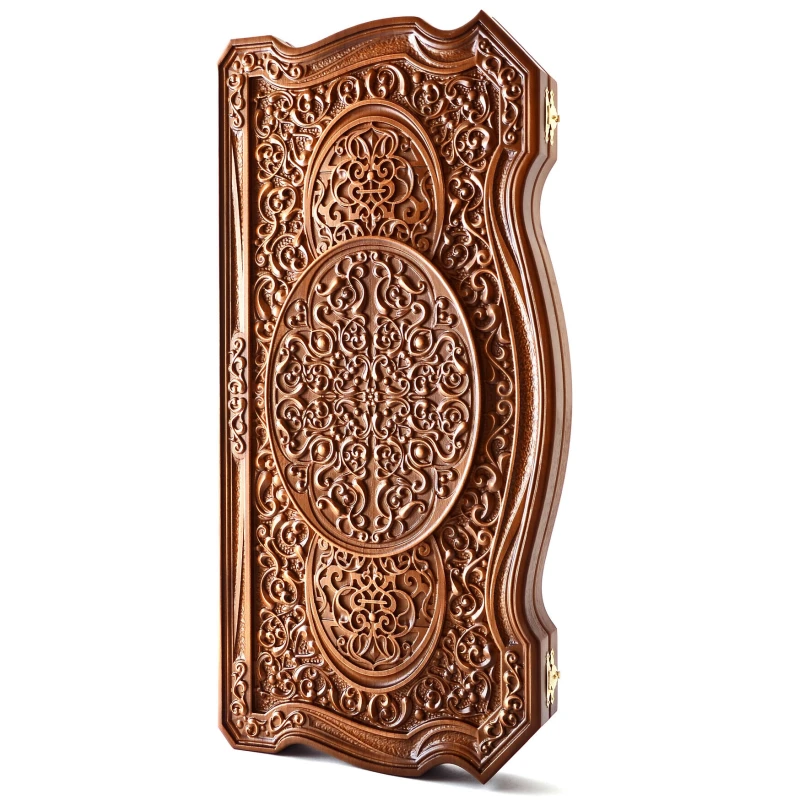 Резные нарды из массива бука. В комплекте игральные кости и фишки. Доска закрывается на 2 замка. Производство Россия.