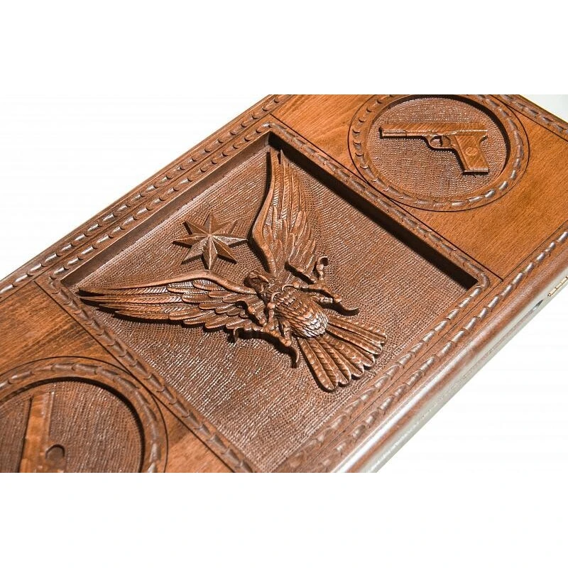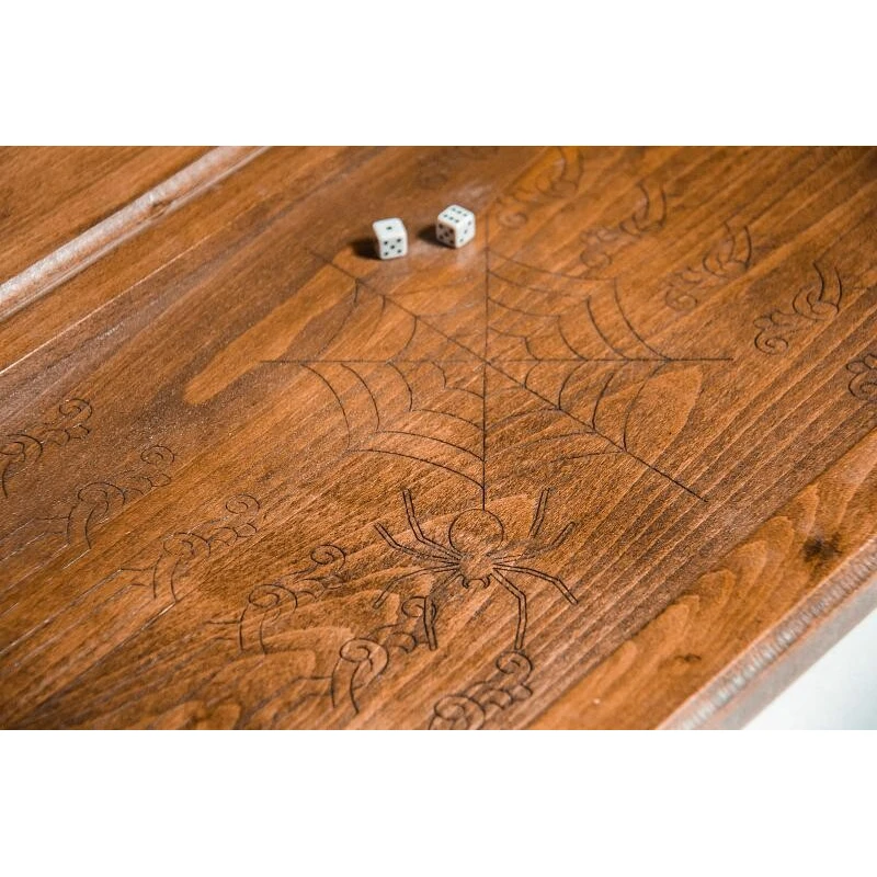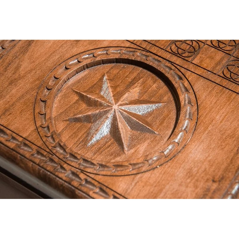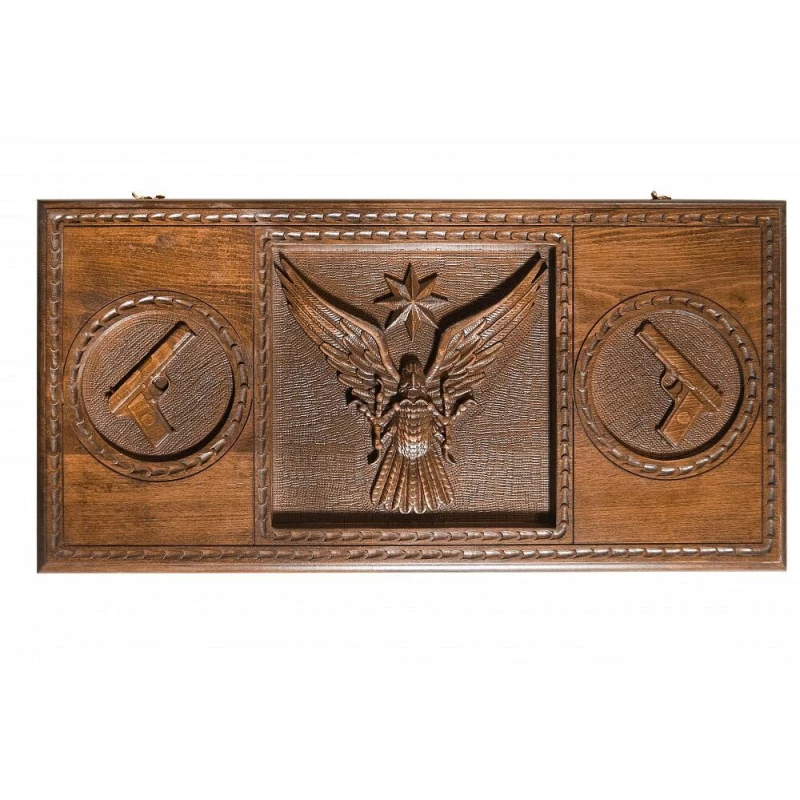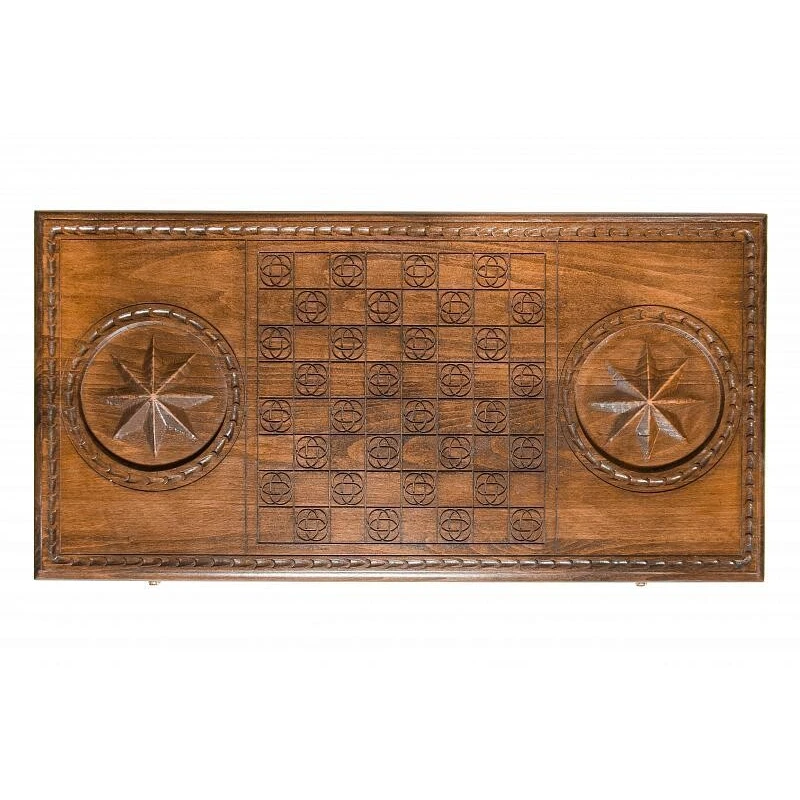 Мастера из Армении всегда уделяют большое внимание своим изделиям, причём не только в части используемых материалов, но и в оформлении, что и видно по резным нардам «Жизнь блатная». Здесь Григорий Устян решил применить бук, который отличается хорошей прочностью, но при этом позволяет купить нарды недорого. Петли и крючки сделаны из бронзы, способной выдерживать сотни открытий створок. На лицевой стороне задней створки предусмотрено специальное поле для игры в шашки.Лицевая сторона нард выполнена в сдержанном стиле, ее украшает парящий орел и два пистолета, благодаря специфической тематике нарды можно взять себе либо преподнести в качестве подарка близкому человеку.