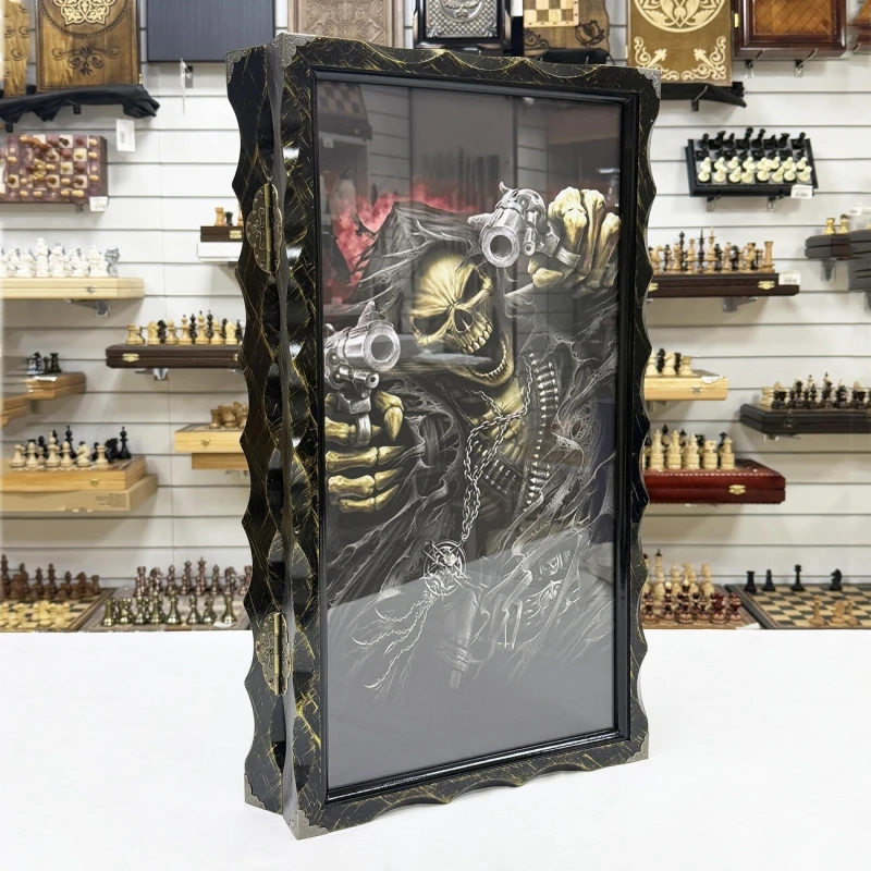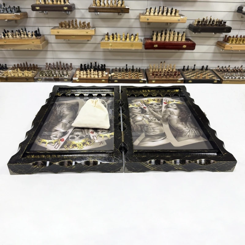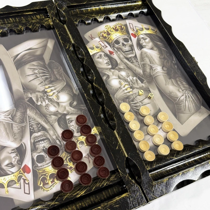 Представляем вам нарды из массива липы и стекла- Скелет и карты, которые станут изысканным дополнением вашей коллекции настольных игр. Размеры в раскрытом виде составляют 63 х 64 х 4 см, что делает их удобными для игры и демонстрации.