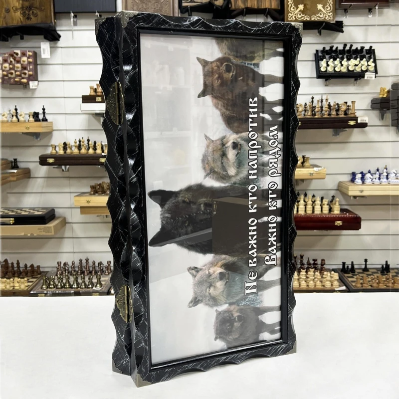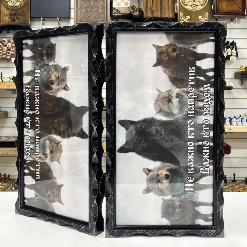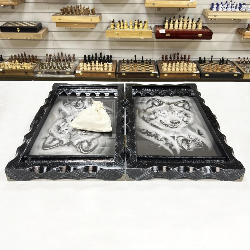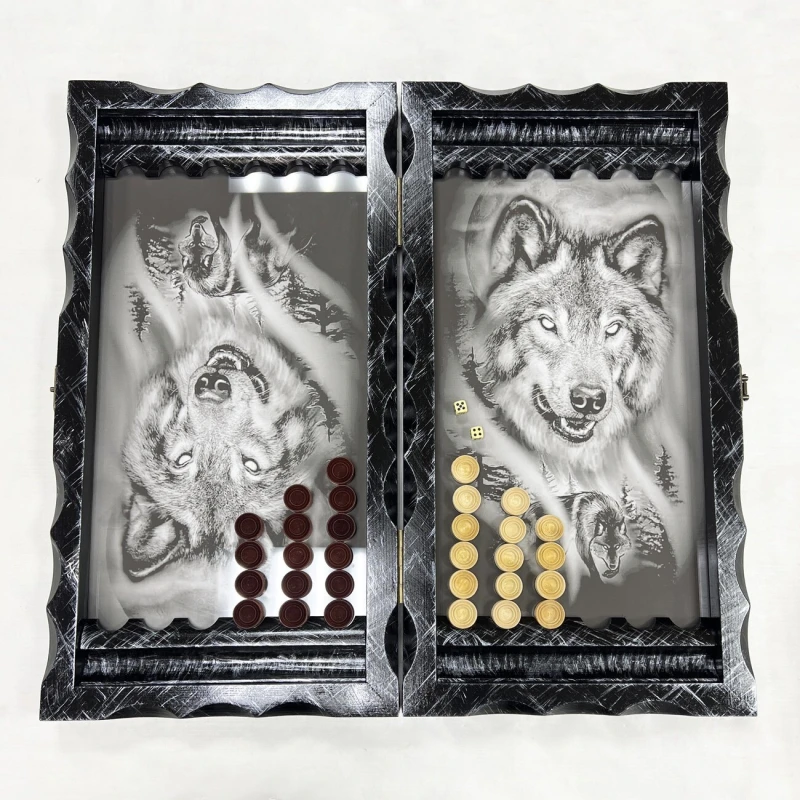 Представляем вам нарды из массива липы и стекла- Волчья стая, которые станут изысканным дополнением вашей коллекции настольных игр. Размеры в раскрытом виде составляют 63 х 64 х 4 см, что делает их удобными для игры и демонстрации.