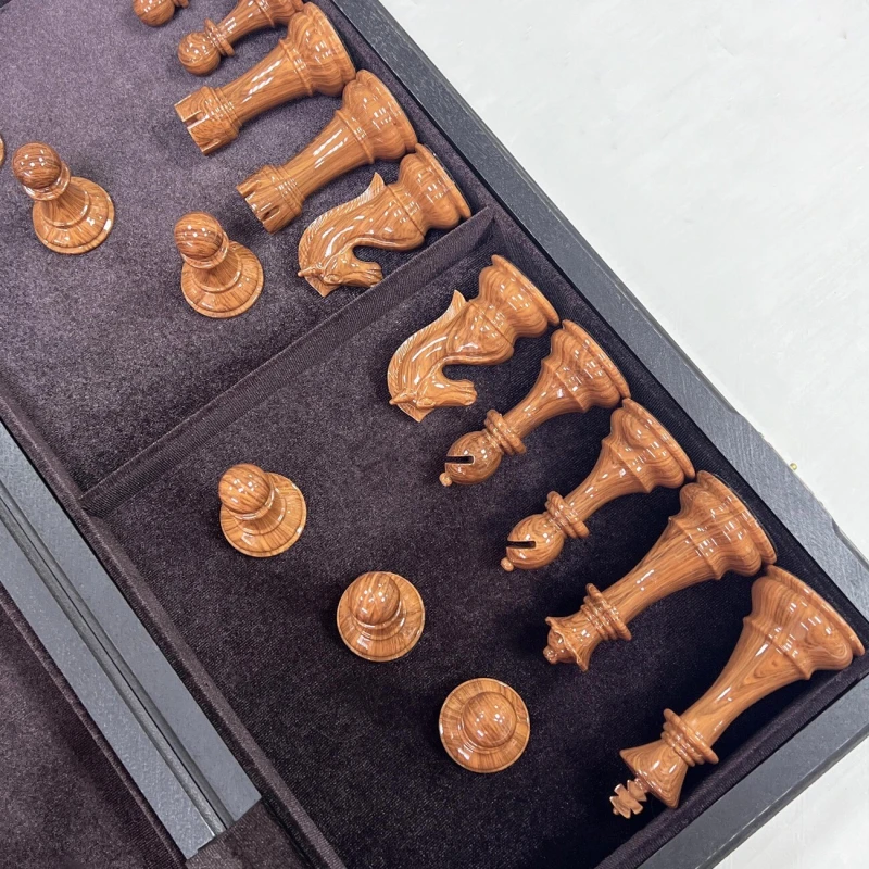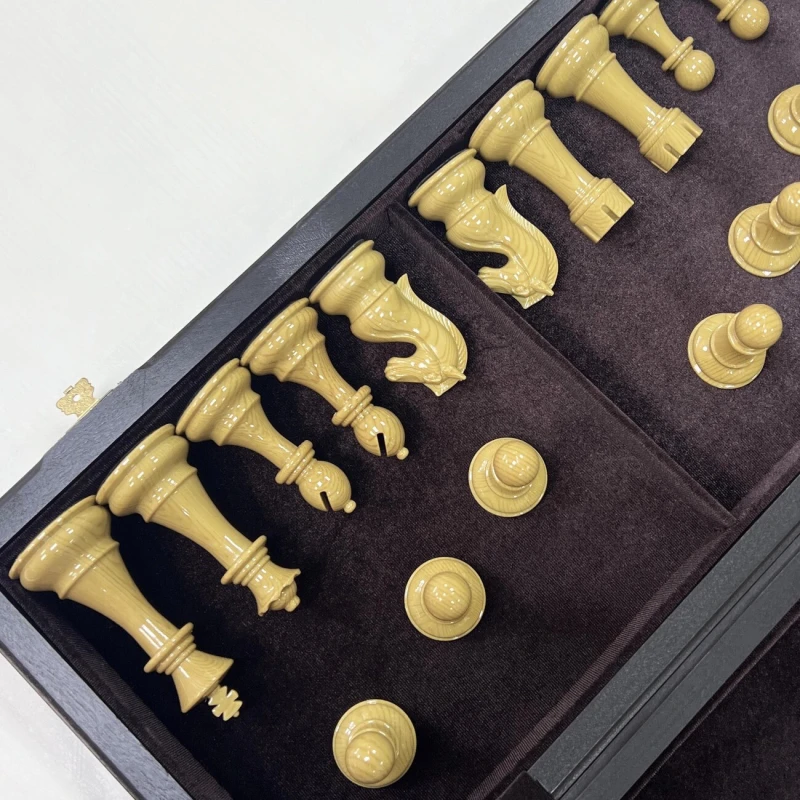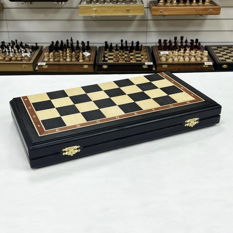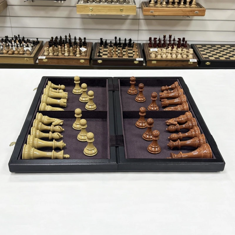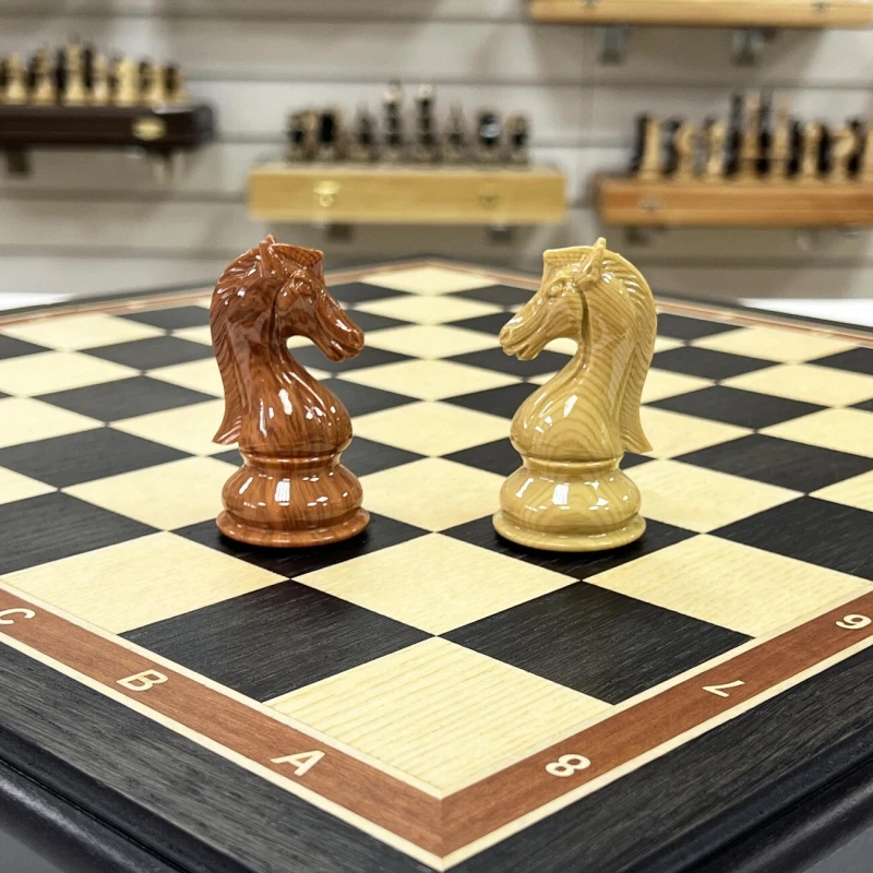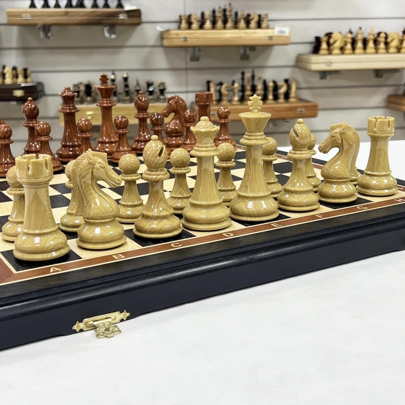 Шахматный набор подарочный: складная доска из ценных пород дерева (моренный дуб, ясень, береза) с размерами 50х25 см в сложенном виде. Фигуры классический Стаунтон выполнены из композитных материалов, король высотой 11 см, пешка 6 см. Шахматные фигуры очень прочные и тяжелые. Особенность наборы в красивом шахматном коне. Фигуры приятно держать в руке за счет утяжеления и хорошей обработки. Снизу есть подклейка из эко кожи, что бы не царапать доску. Рамзер клетки 5 на 5 см, диаметр основания короля 4.7 см. Упакованы в транспортировочную коробку.