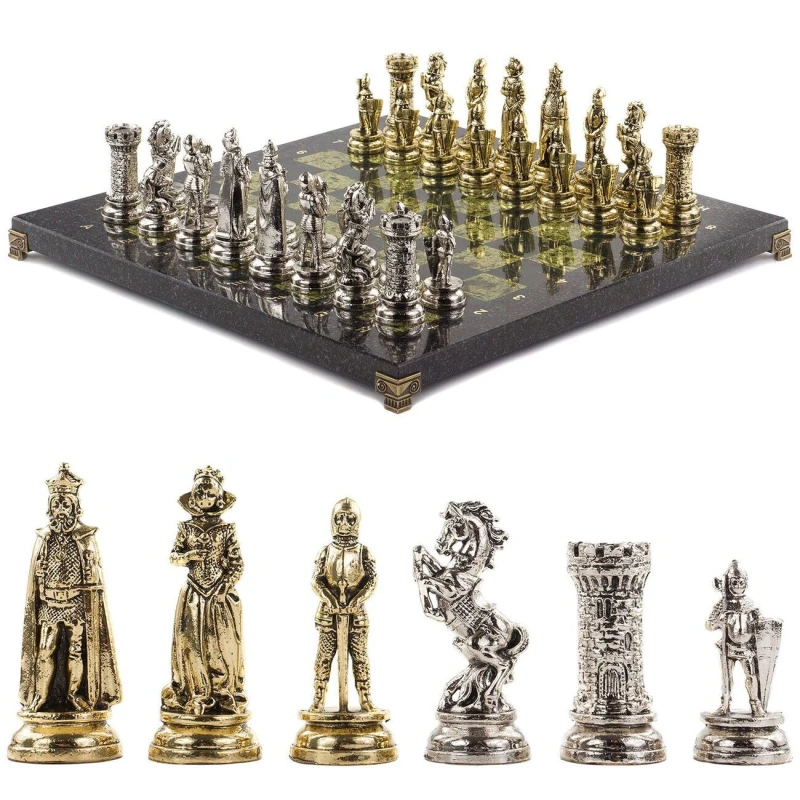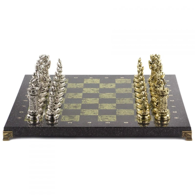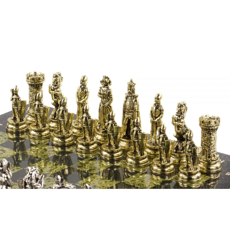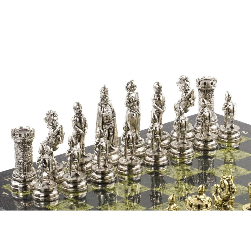 Шахматы изготовлены из зеленого змеевика, фигуры из металла с покрытием под золото и серебро, имеют размеры доски 44х44х3 см и весят 14500 г.
