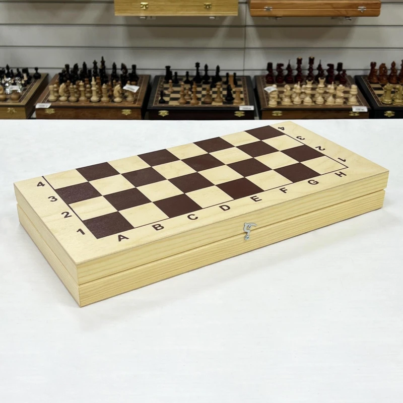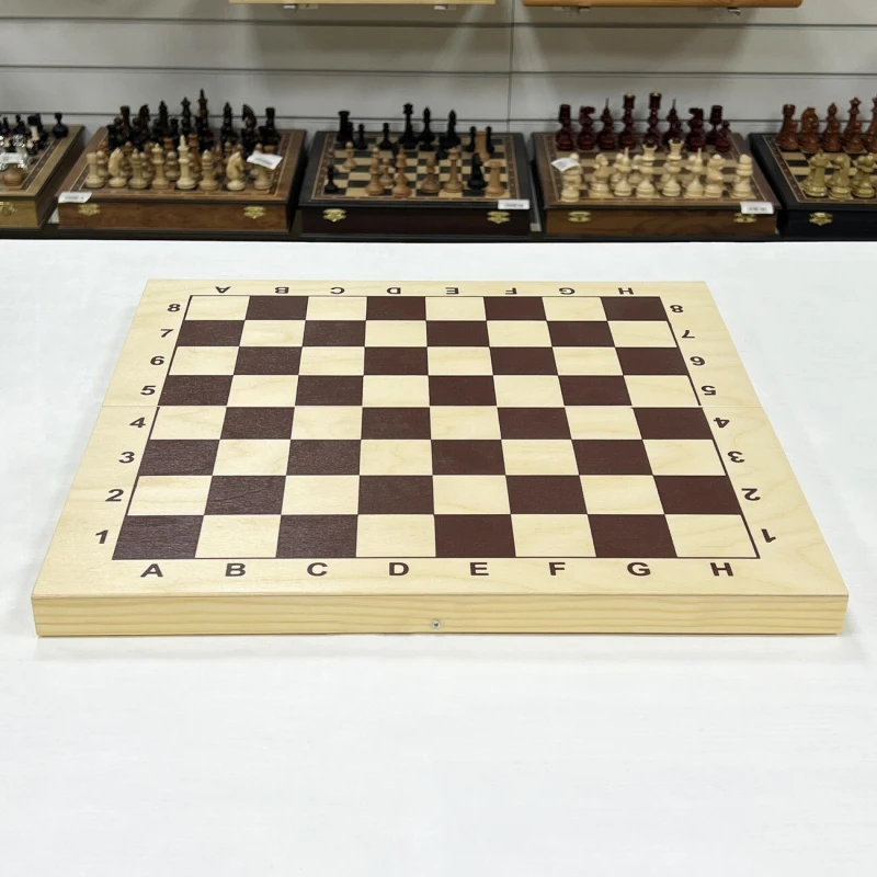 Классическая шахматная доска без фигур из дерева. Размер доски в разложенном виде 43 на 43 см. Размер клетки 4.5 на 4.5 см. Материал доски сосна. Сделаны в России.