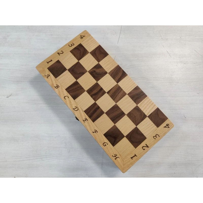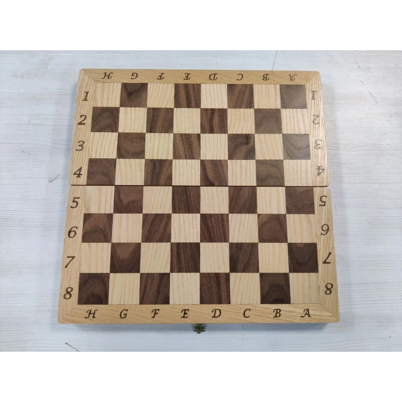 Складная классическая шахматная доска из дерева. Размер доски в разложенном виде 41.5 на 41.5 см. Размер клетки 4.5 см. Материал доски ясень, красное дерево. Корпус доски сделан из массива бука. Производство Россия.