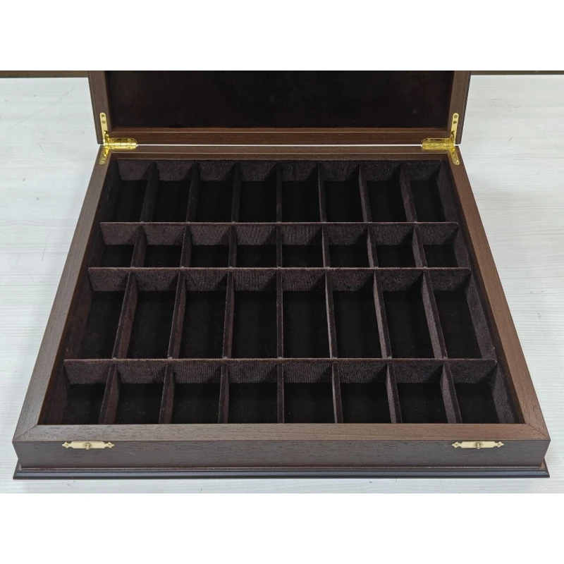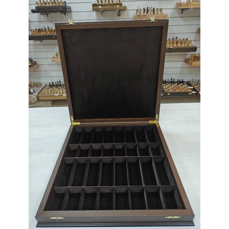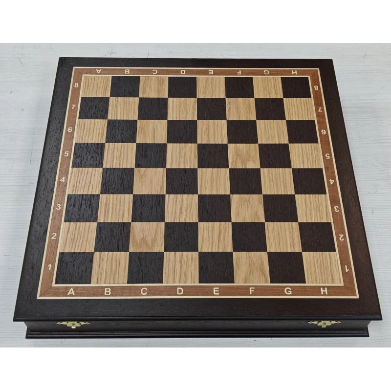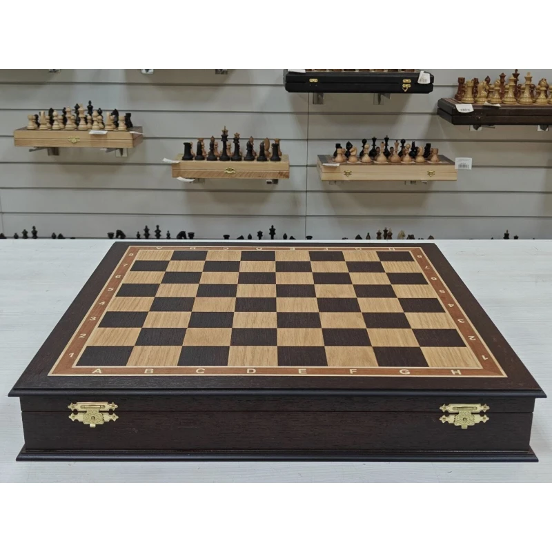 Шахматная доска по форме ларца с бархатными ячейками для хранения фигур. Подойдут для фигур с диаметром основния до 4 см. Ларец большой и тяжелый , это нужно учитвывать при хранения. Шахматное поле собирается в технике маркетри из дерева Венге и дуба. Размер доски 45 на 45 см. Размер клетки 4.5 на 4.5 см. Сделаны в России. Закрываются на 2 замочка. Покрыты матовым лаком.