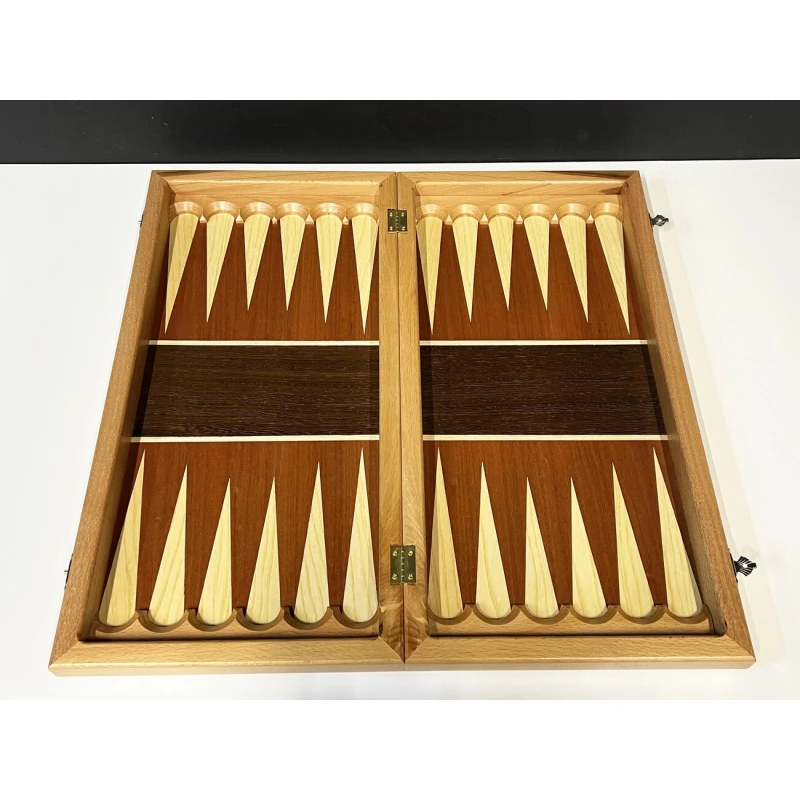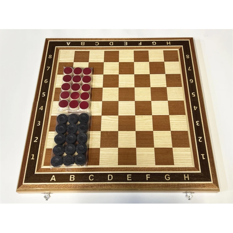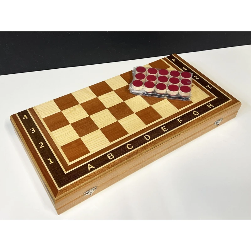 Шахматная доска собирается вручную в технике маркетри из красного дерева и ясеня. Корпус доски сделан из бука.