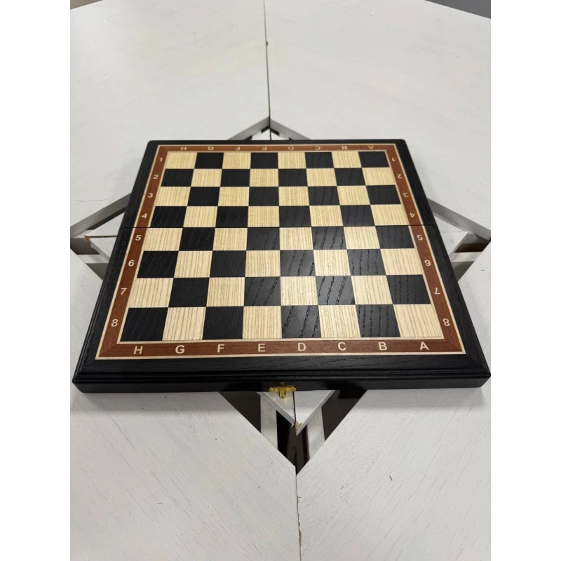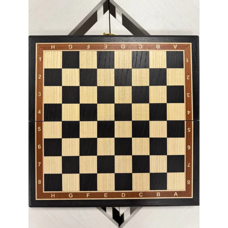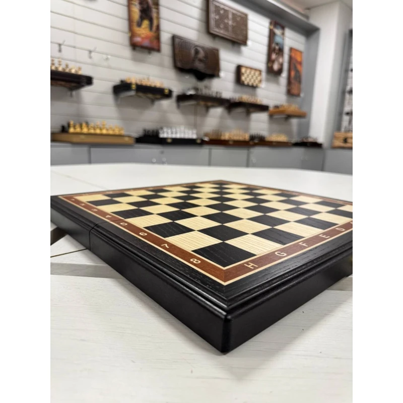 Турнирная шахматная доска без фигур из дерева. Размер доски в разложенном виде 40 на 40 см. Размер доски в сложенном виде 40 на 20 см. Размер клетки 4 на 4 см. Шахматная доска собирается вручную в технике маркетри из ценных пород дерева. Сделана в России. Внутри доска покрыта бархатом. Подойдет для фигуры с диаметром основания до 3.8 мм.