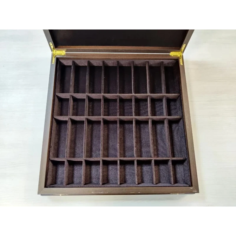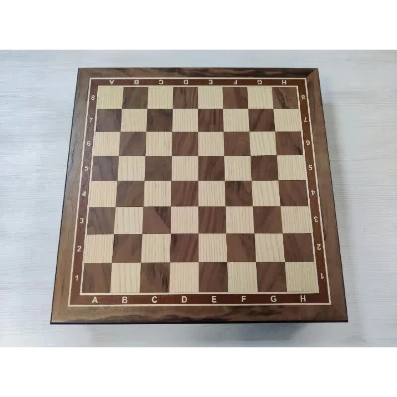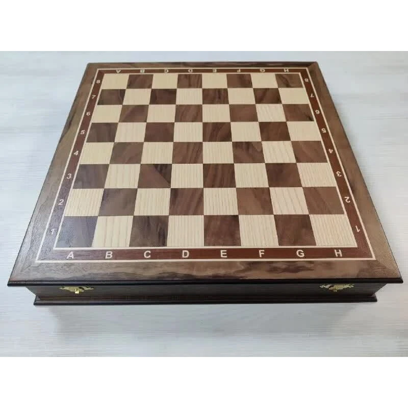 Подарочная шахматная доска по форме ларца. Сделана в технике маркетри из ценных пород дерева. Темная клетка орех, светлая клетка ясень. Внутри доски ячейки для каждой фигуры. Доска закрывается на замок. Подойдут фигуры размером от 9 до 11.5 см высота короля, высота пешки от 5 до 6.5 см. Размер клетки 4.5 на 4.5 см. Ручная работа.