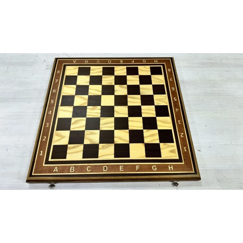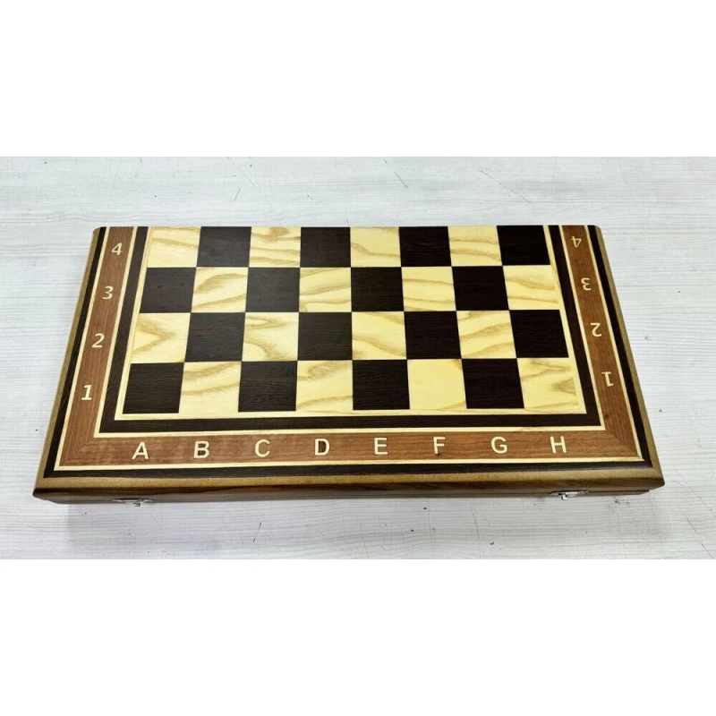 Складная шахматная доска из венге, ясеня и бука. Размер доски в разложенном виде 50 на 50 см. Подойдут для фигур с максимальным основанием 4.7 см. Шахматное поле собирается в технике маркетри из ценных пород дерева, светлая клетка ясень, темная клетка венге. Размер клетки 5 см. Купить деревянные шахматные доски, шахматные фигуры можно у нас в магазине в Москве и Санкт Петербурге.