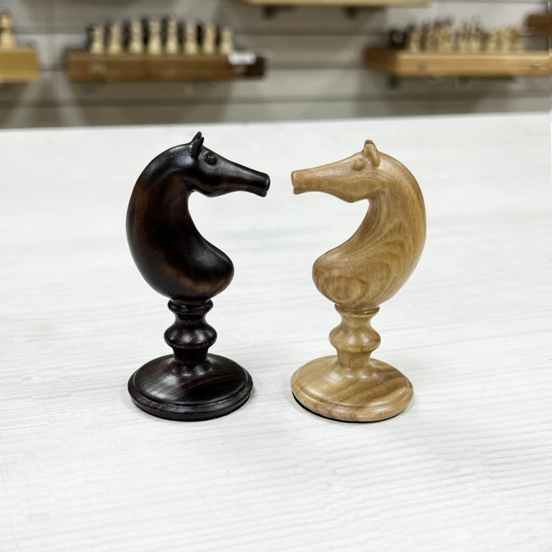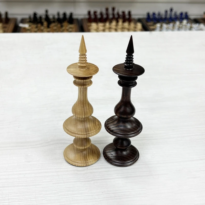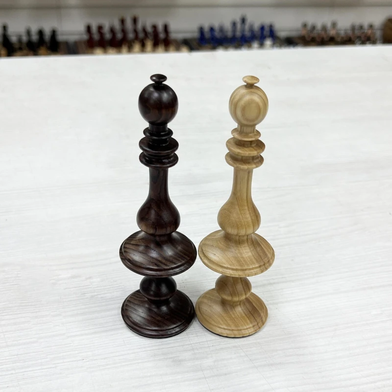 Эксклюзивные шахматные фигуры из массива ясеня для больших досок с клеткой от 5 см. Высота короля 14 см, высота пешки 7 см. Фигуры достаточно изящные с хорошей детализацией.