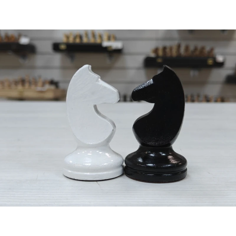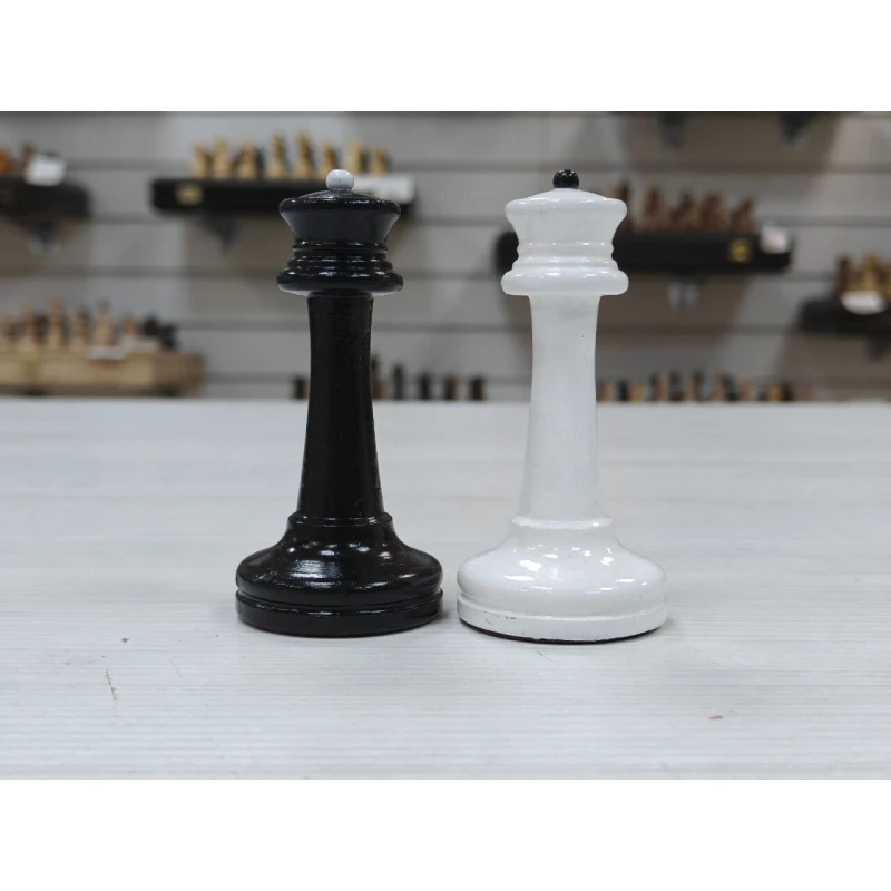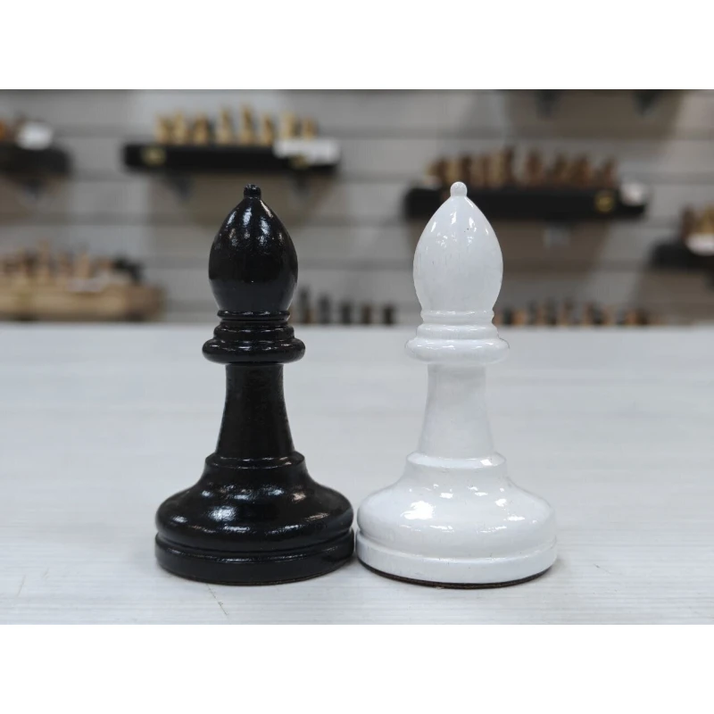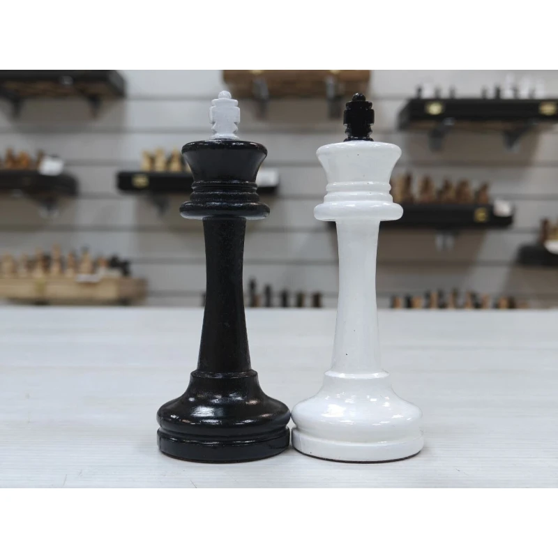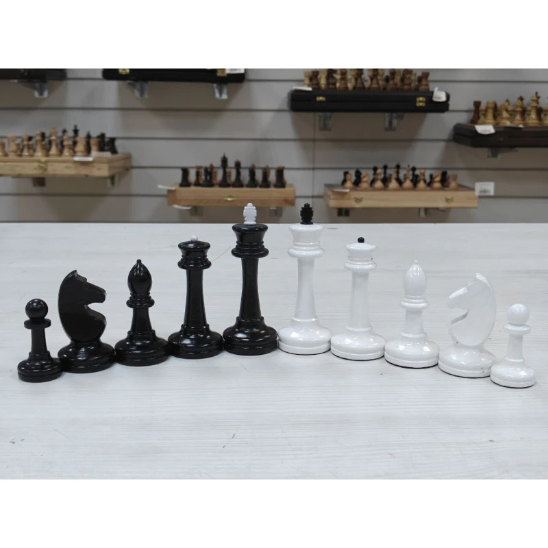 Классические шахматные фигуры черно белого цвета из массива бука. Высота короля 10.5 см. Высота пешки 5.2 см. Фигуры с утяжелением. Снизу есть подклейка из бархата. Сделаны в России. Подойдут для досок с клеткой от 4.5 см до 5.5 см.