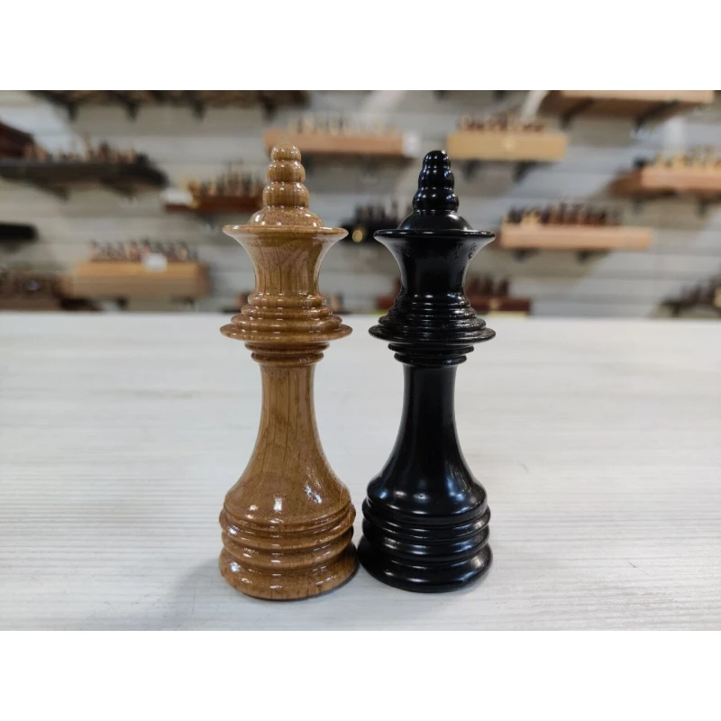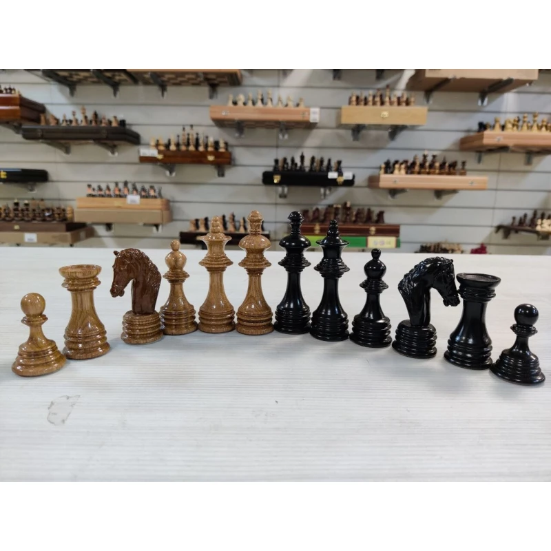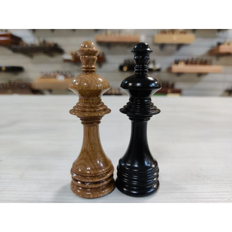 Деревянные шахматные фигуры ручной работы из дуба. Высота короля 10 см, высота пешки 5 см. Фигуры утяжеленные. Диаметр основания короля 3 см, диаметр основания пешки 3 см. Подойдут для доски с клеткой 4 см, 4.5 см, 5 см.