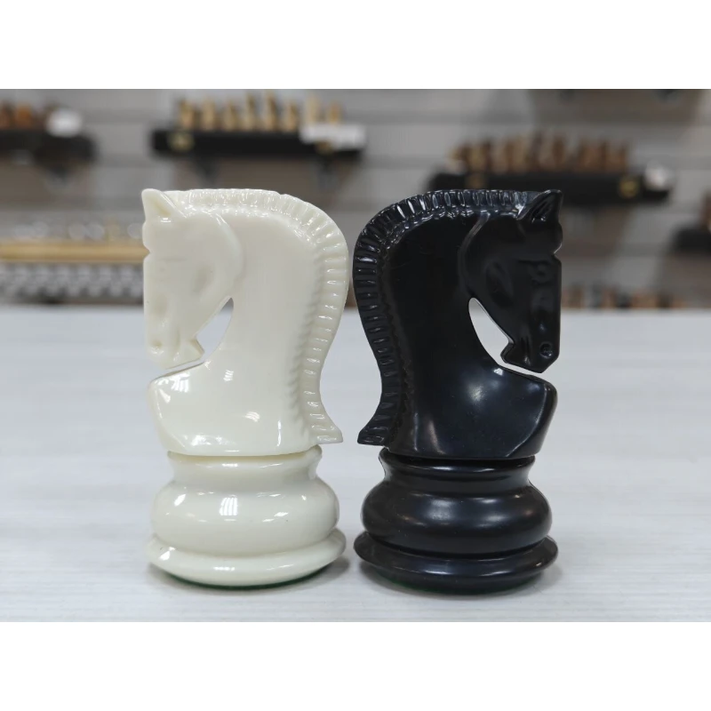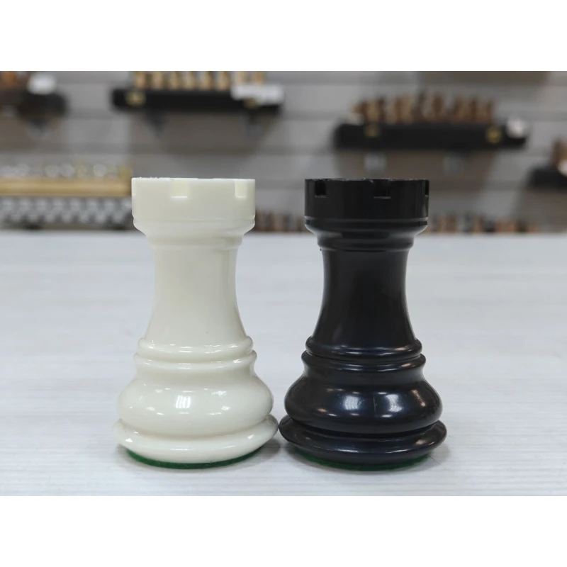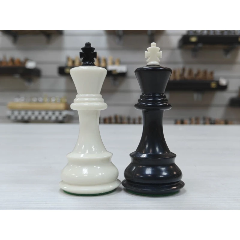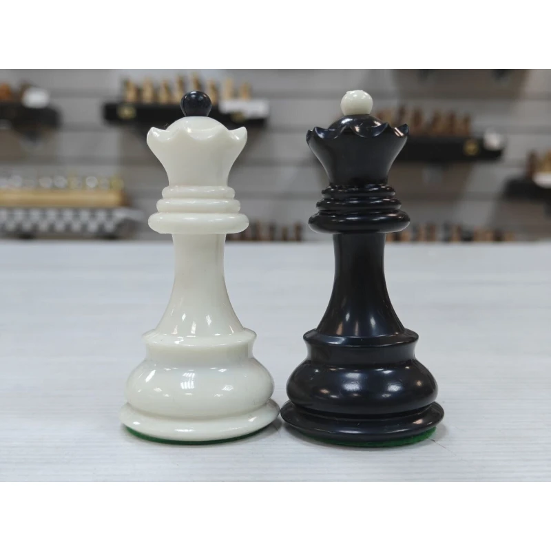 Комплект пластиковых фигур с утяжелением выполнен в строгом черно-белом цвете. Пластик тактильно приятный, фигуры отлично подойдут к доске с размером клетки 4.5см или 5см. В комплекте идет дополнительный ферзь. Фигуры с текстильной подклейкой зеленого цвета